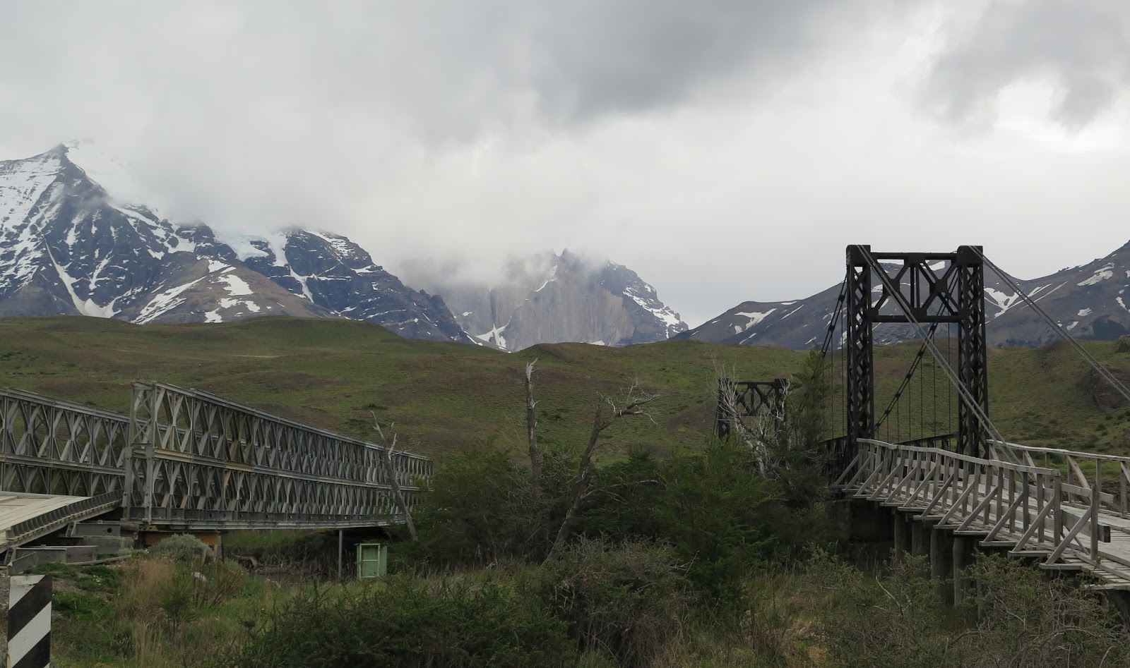 En un primer momento la pista desciende hasta cruzar un puente metálico que se alza sobre el río Paine.