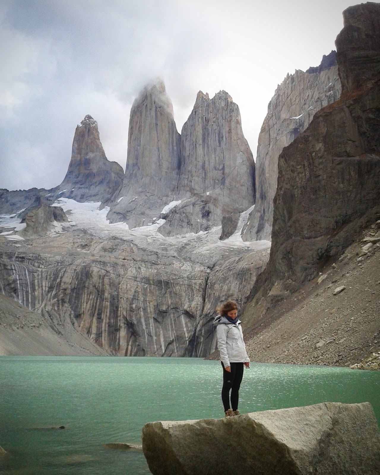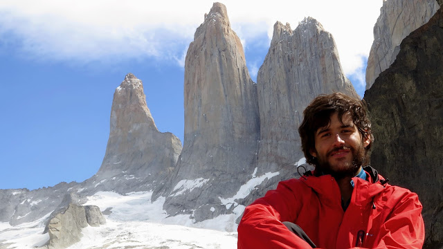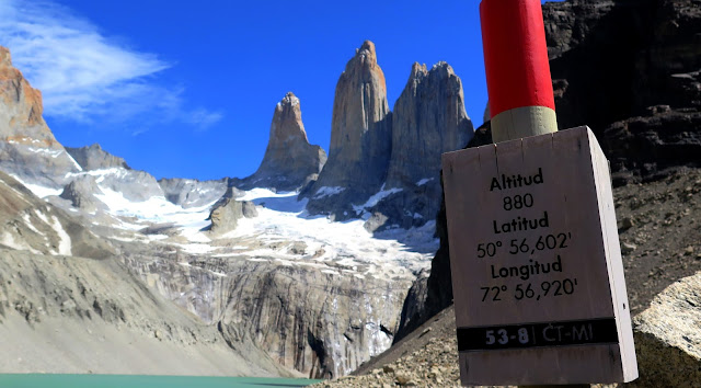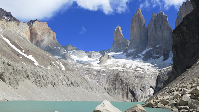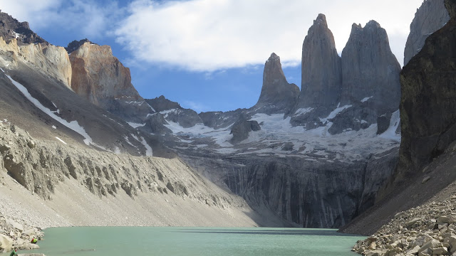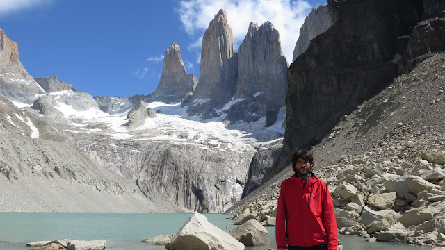 A nuestros pies un pequeño lago de aguas color turquesa, algo revueltas por el viento en la zona. Sobre dicho lago, se alzan los inmensos colosos graníticos de las Torres del Paine, unos 2000 metros por encima de nuestras cabezas. La Torre Norte o Monzino (2600 m); la Torre Central (2800 m) y la Torre Sur o D’Agostini (2850 m), todas ellas parecen arañar el hoy despejado cielo patagónico. A sus pies un glaciar, cuya fuerza antaño modeló estas paredes hasta convertirlas en las espectaculares moles que son hoy en día.