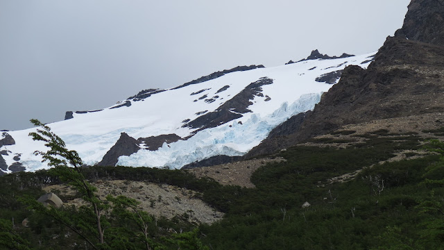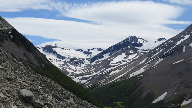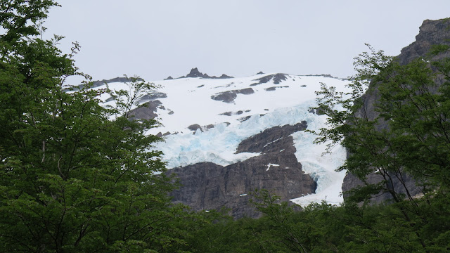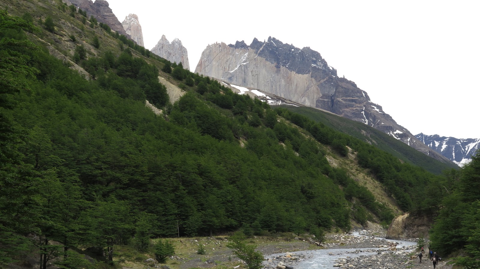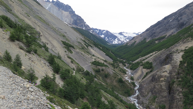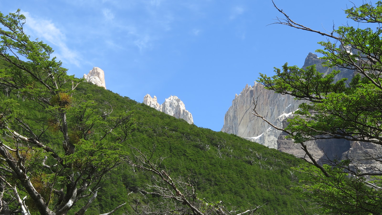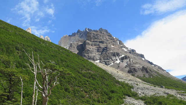 Ya podemos contemplar la zona a la que nos dirigimos, que todavía queda algo lejos: el Cerro Nido de Cóndor y las puntas de las Torres del Paine asoman más allá de la ladera boscosa de la montaña.