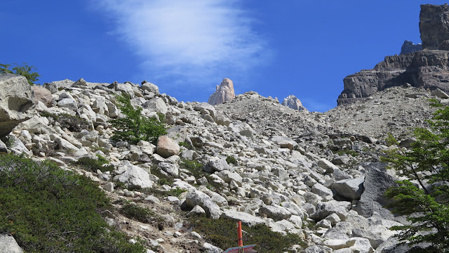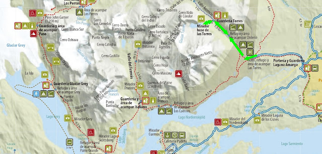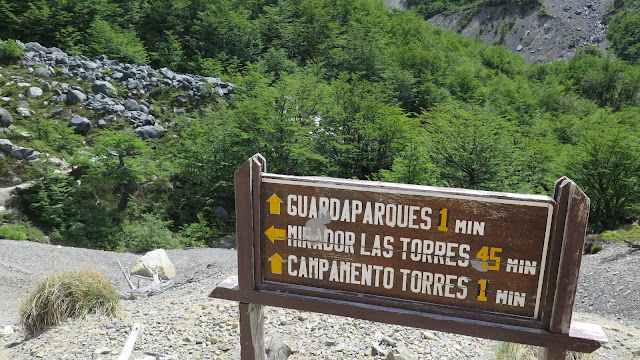 Han transcurrido 3 horas y 45 minutos cuando llegamos al desvío hacia el Campamento Las Torres. No debemos tomar dicho desvío, sino que la ruta sigue, ahora con mayor pendiente, en dirección a las enormes torres que se yerguen enfrente de nosotros.