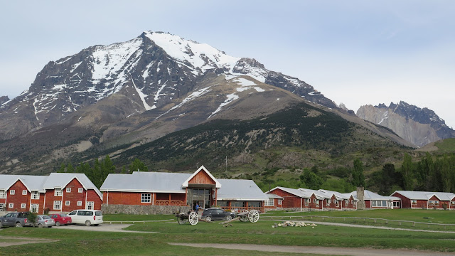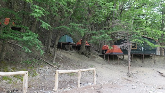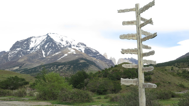 Caminamos 5 minutos por una amplia pista, hasta que llegamos a un enorme cartel donde vemos desvíos en todas las direcciones posibles: hacia la derecha iríamos al Campamento Serón y al Refugio Dickson; hacia detrás regresaríamos a Laguna Amarga. Nosotros debemos continuar en línea recta, hacia el Campamento Chileno, Campamento Los Cuernos, etc… Pronto dejamos a nuestra derecha una gran cantidad de edificaciones de madera pintada de rojo, parecen alojamientos de bastante lujo.