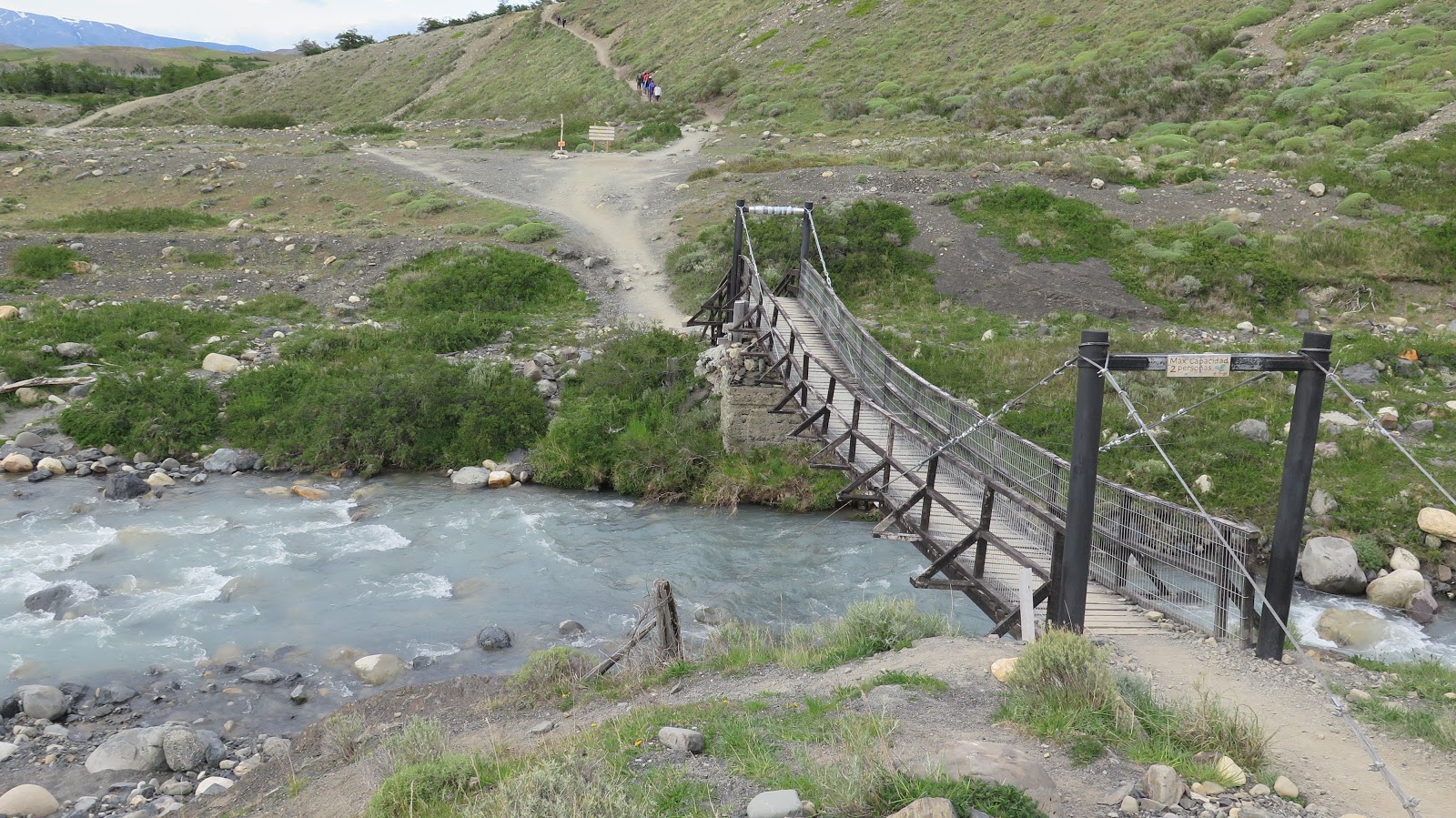 A la media hora de camino llegamos a un puente colgante, que atravesamos. Tras cruzarlo vemos un desvío: hacia la izquierda nos lleva al Campamento los Cuernos, mientras que hacia la derecha nos conduce al Campamento Chileno.