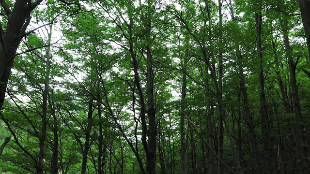 La senda ahora transcurre en suave ascenso por la margen izquierda del río, por un tramo boscoso, muy frondoso. A nuestro alrededor, numerosos riachuelos y unos árboles de espectaculares tonalidades verdosas. Las copas de los árboles se mecen en ocasiones con violencia, lo que nos hace intuir que más arriba habrá un fuerte viento.