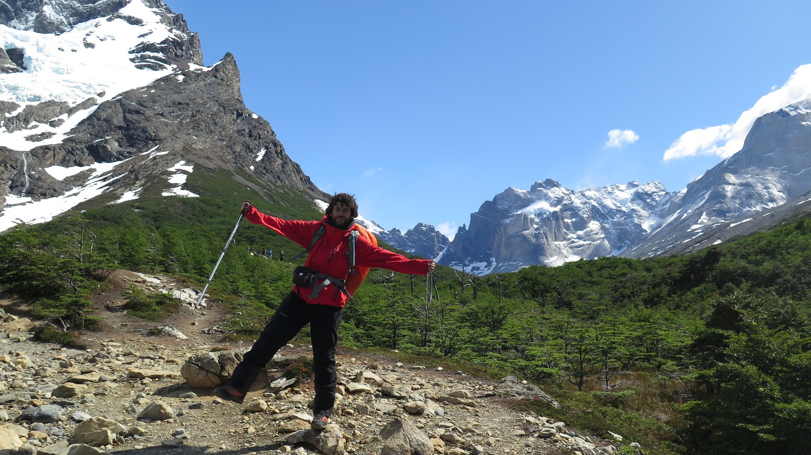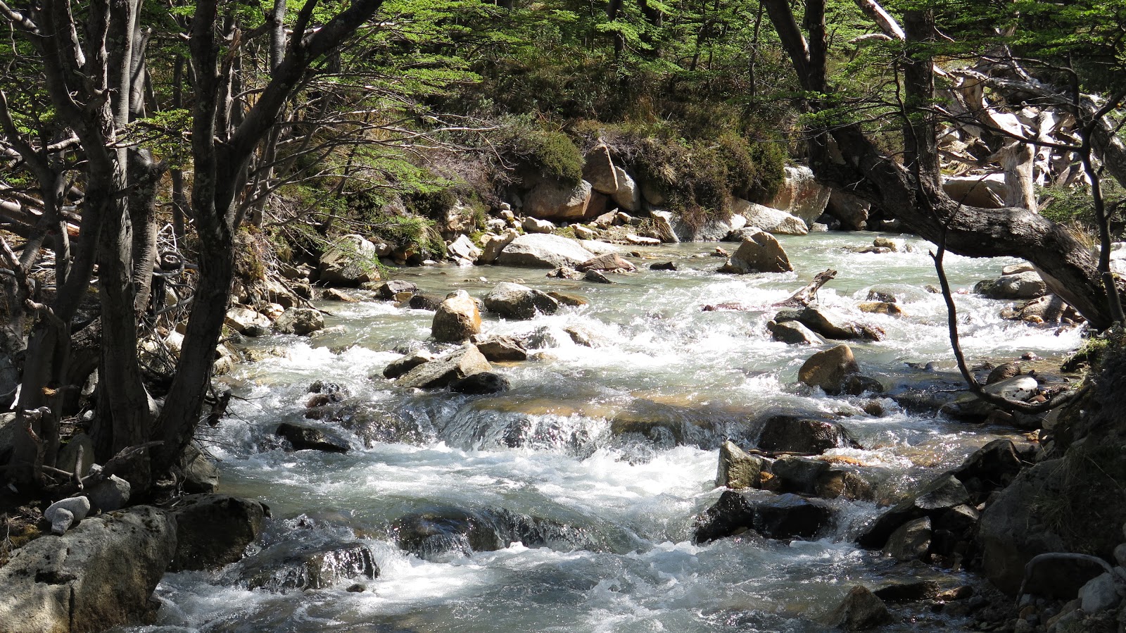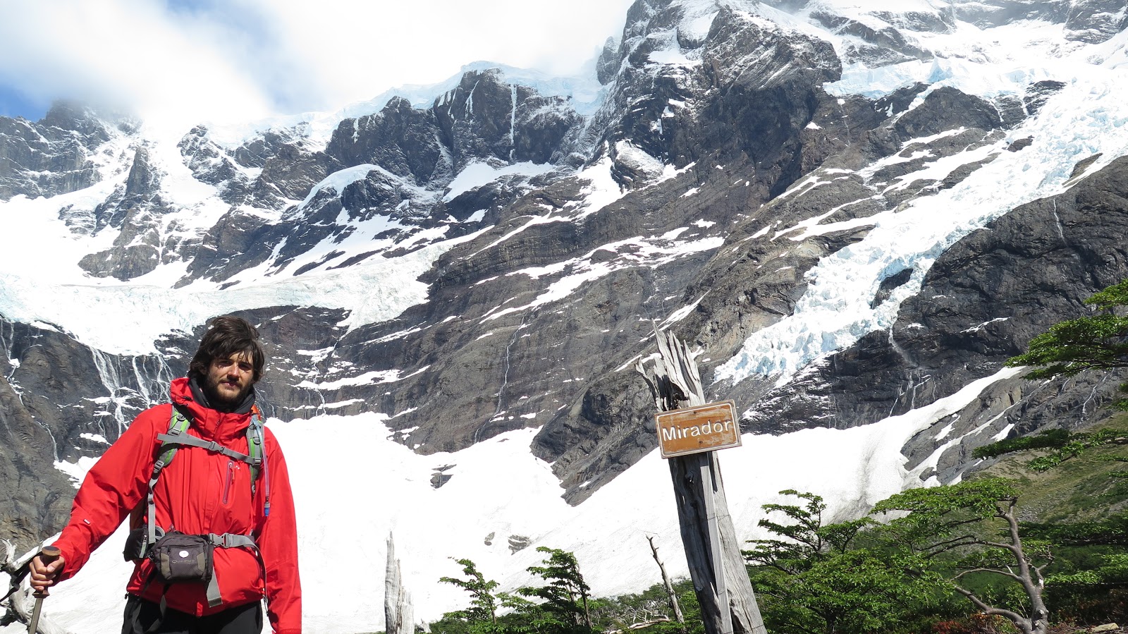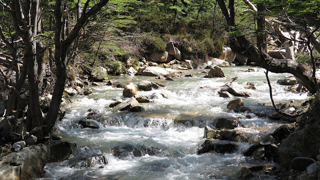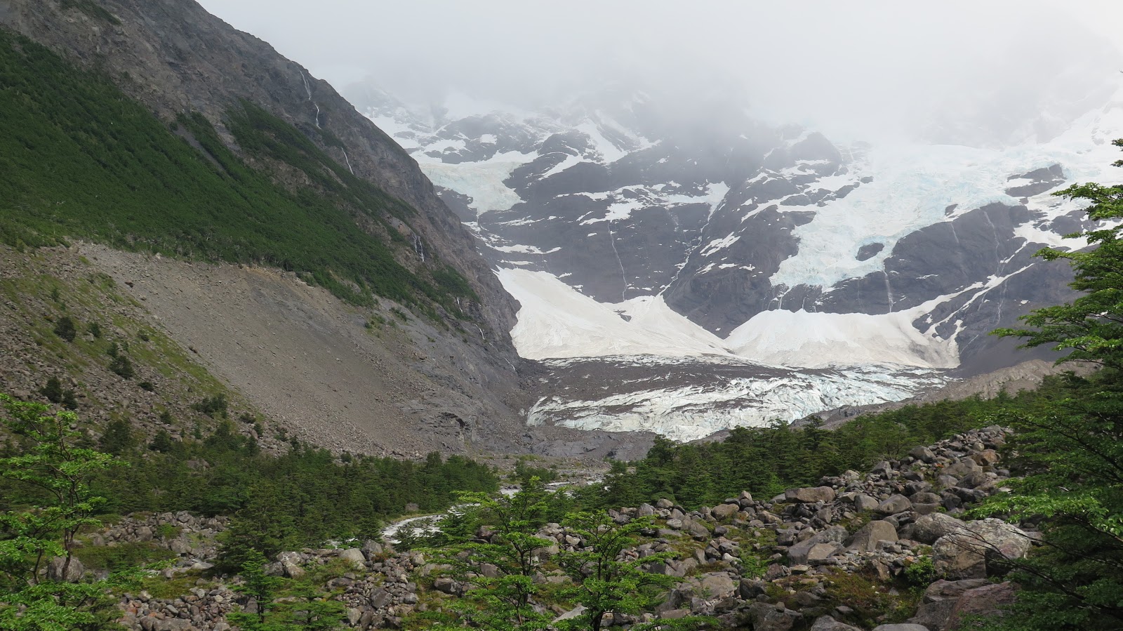 Con un extra de motivación debido al cambio de tiempo, además de las primeras montañas y glaciares que asoman en los claros de bosque, continuamos caminando.