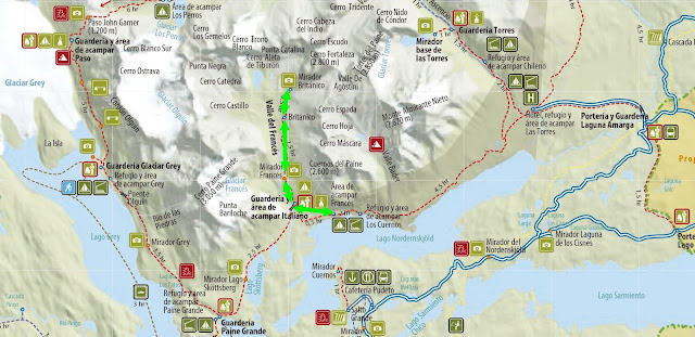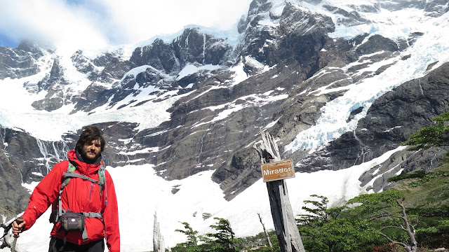 Llevamos una hora y media de camino cuando llegamos a una gran zona despejada de árboles, el Mirador Francés, indicado por un pequeño poste de madera. Nos encontramos ante una panorámica sobrecogedora, bellísima. Estamos en la entrada del Valle del Francés, que ya se muestra en todo su esplendor. Destacan, a nuestra derecha, el Cuerno Principal de los Cuernos del Paine y los cerros Hoja (2200 m), Espada (2500 m) y Fortaleza (2681 m). A nuestra izquierda el gigantesco Glaciar del Francés, proveniente del Cerro Paine Grande. Mirando hacia atrás vemos, al fondo, las aguas azules de los lagos Nordenskjöld y Pehoé.
