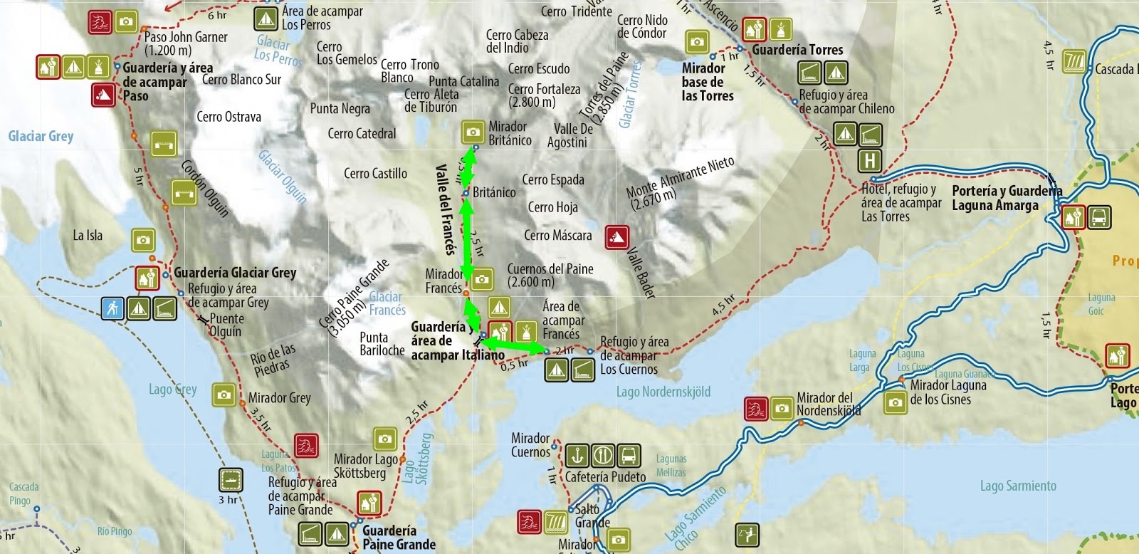 Itinerario: Campamento Francés – Campamento Italiano –Mirador Francés – Mirador Británico – Mirador Francés – Campamento Italiano – Campamento Francés
