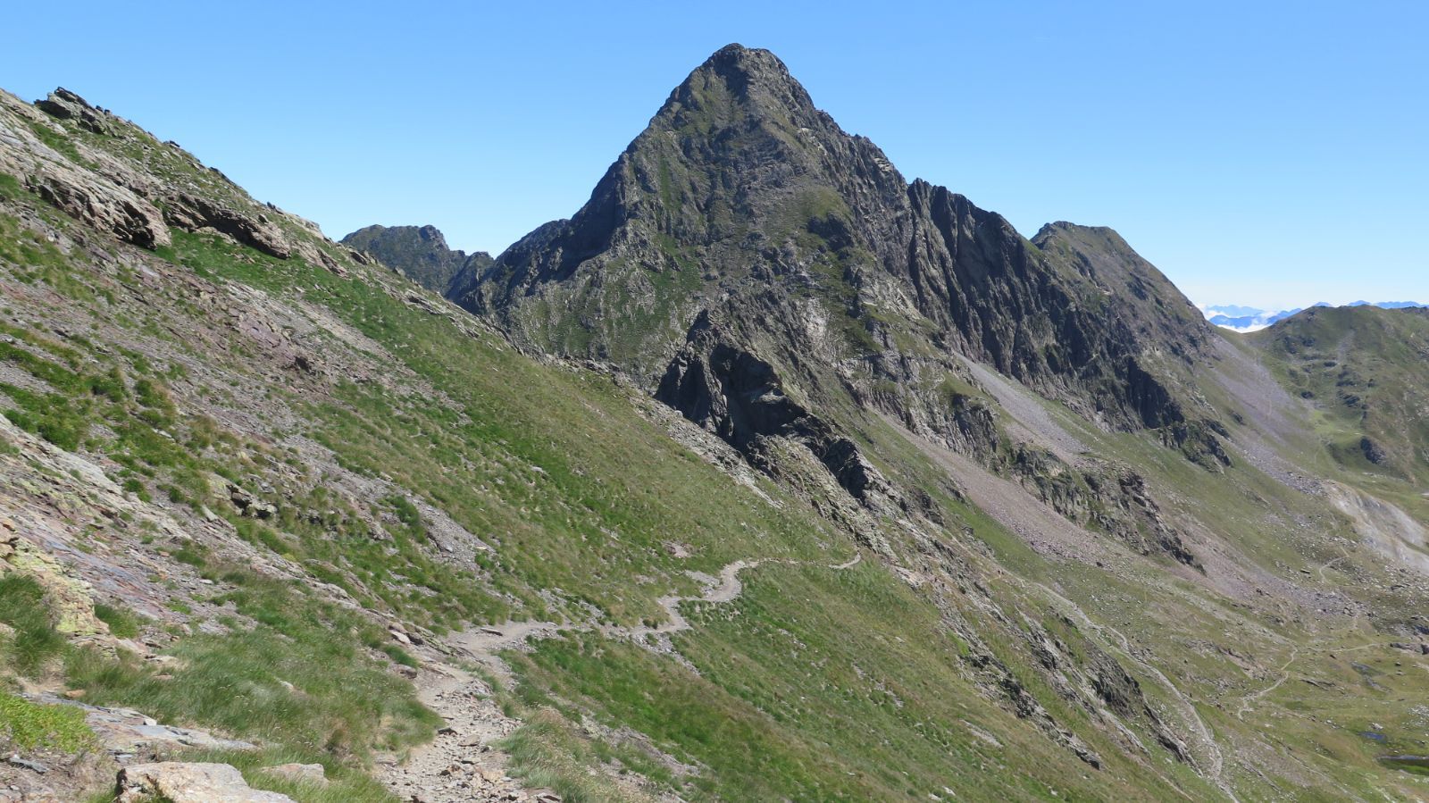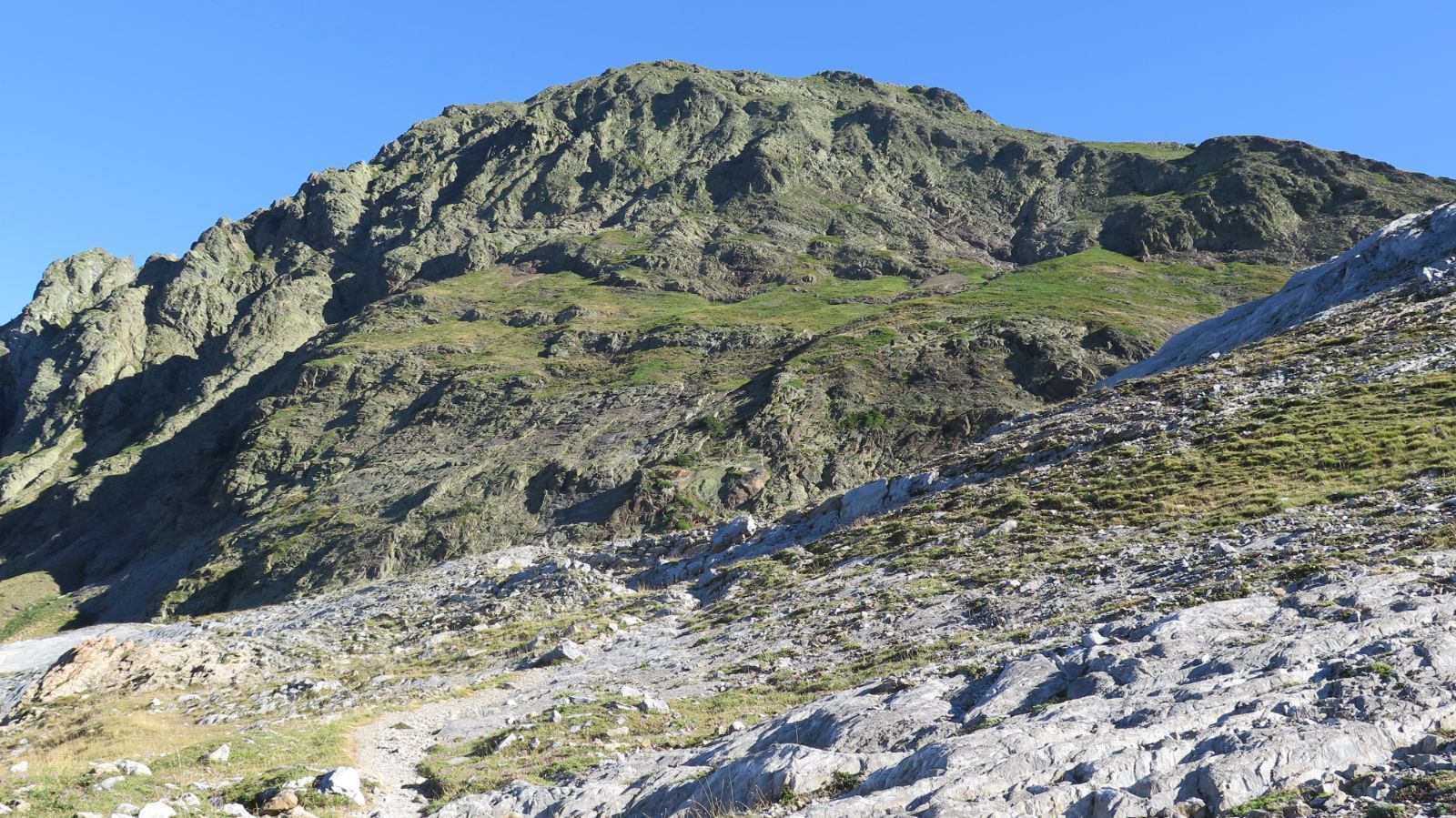 El camino de regreso del Salvaguardia se hace cómodo, por lo que bajamos rápidamente. Llegamos de nuevo al Portillón de Benás, continuando ahora en dirección este, llaneando o en suave descenso. Echamos, cada pocos minutos, un vistazo atrás, ya que la imagen del Salvaguardia desde este punto es impactante. ¡Parece mentira que hayamos subido por ahí!