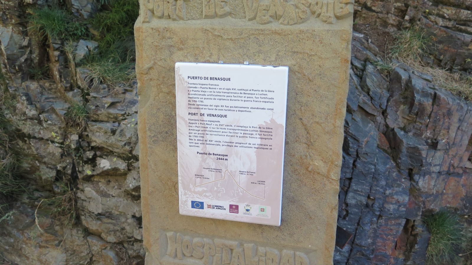 Apenas nos quedan cinco minutos de marcha hasta llegar al Portillón de Benás (5,1 km; 1h 45 minutos; 2444 metros de altitud). Paso fronterizo, antaño frecuentado por comerciantes y contrabandistas, así como por exiliados de la Guerra Civil, se trata de un mítico enclave pirenaico. Merece la pena detenerse brevemente a leer la placa conmemorativa, echar un vistazo a los Ibones de Boums du Port (en territorio francés) y contemplar la panorámica hacia el sur, copada por el grandioso Macizo de las Maladetas.
