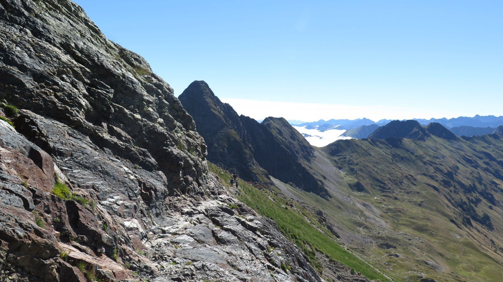 Las vistas desde la cima son espectaculares en todas las direcciones. Hacia el norte, sobresaliendo del mar de nubes, algunas cimas cuyos nombres desconocemos. Hacia el resto de direcciones sí que aparecen algunas cumbres que podemos reconocer: Perdiguero, Posets, Aneto, Maladeta, Pico de Alba… La lista, huelga decirlo, podría alargarse casi hasta el infinito.