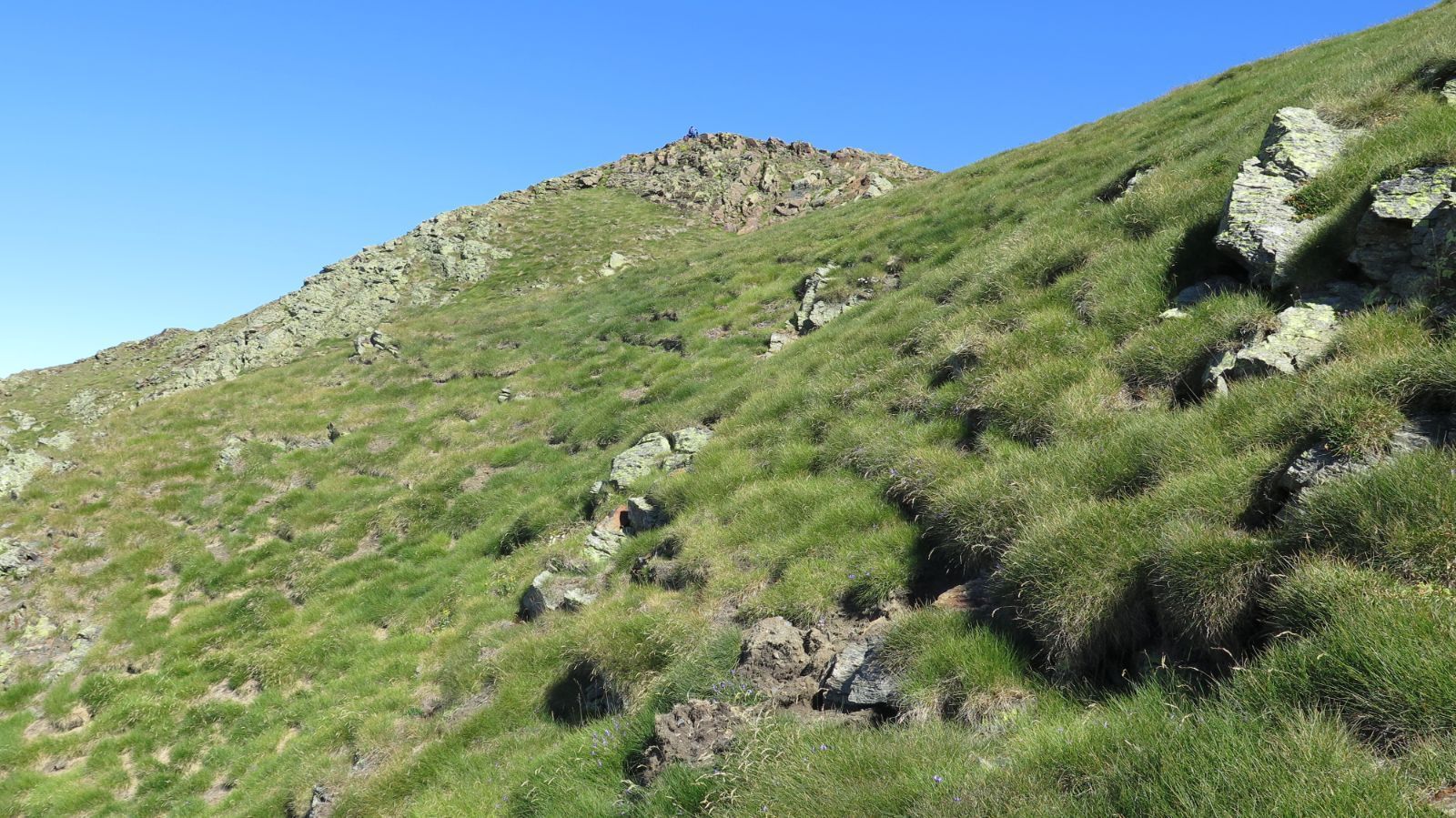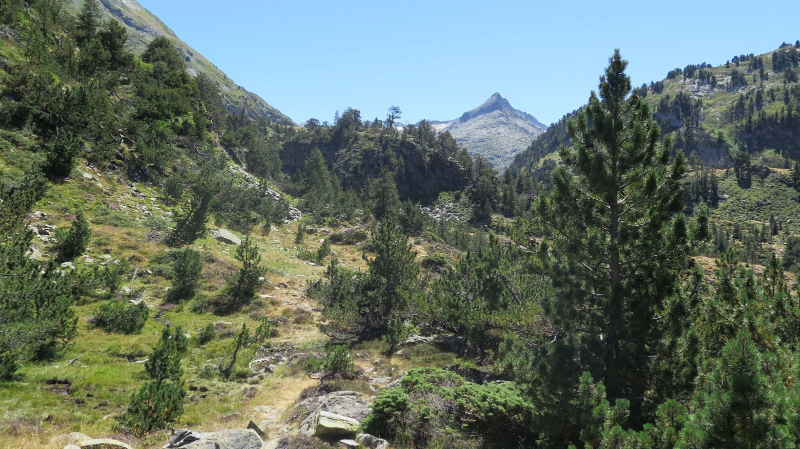 Superado este tramo más duro llegamos a una zona de prados, más agradable, en torno a la cota 2200. Frente a nosotros asoma la Tuca de la Mina y se intuye la hendidura que conforma el Portillón de Benás. Se nota ya el ambiente de alta montaña.