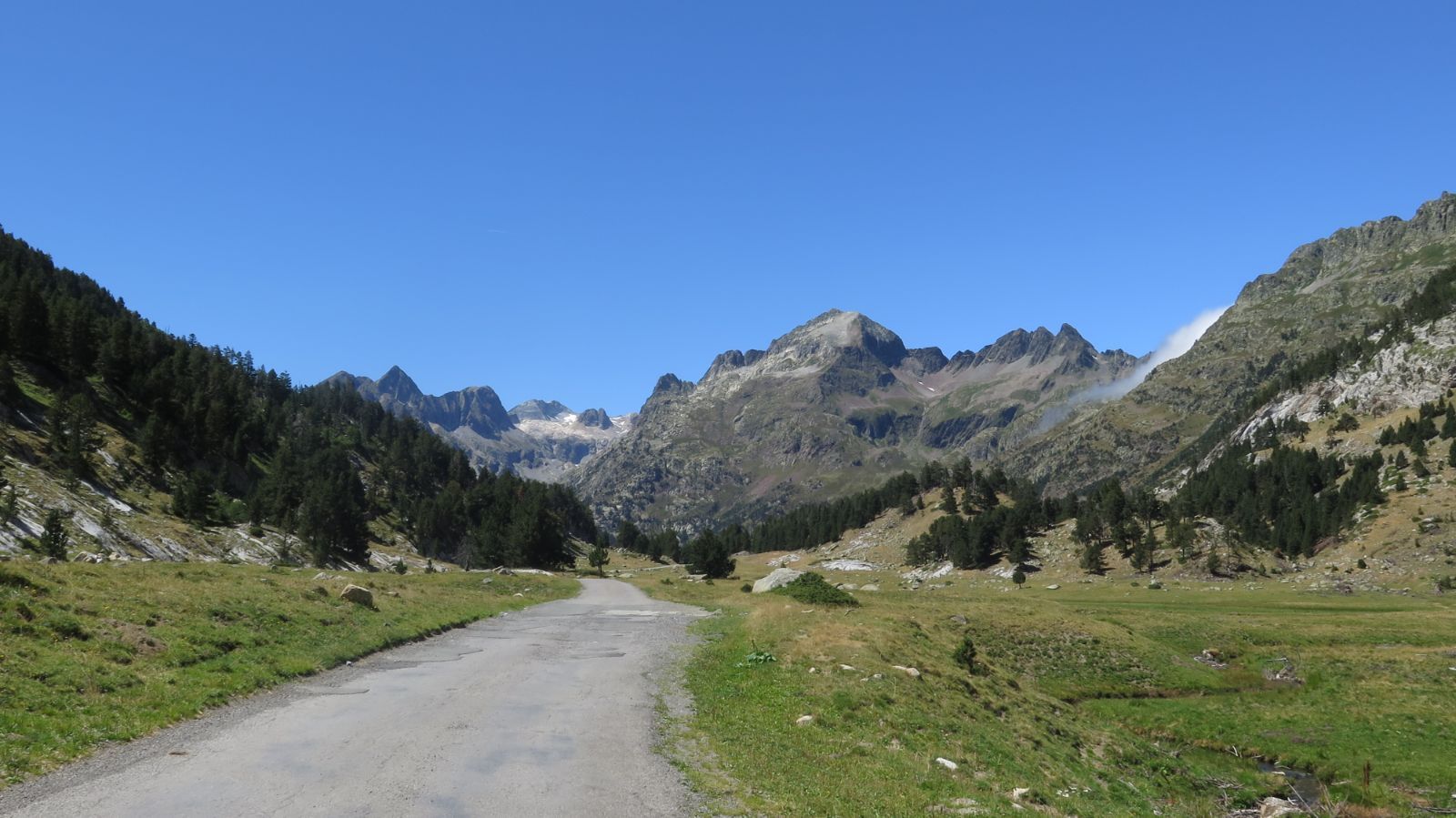 Reemprendemos la marcha por un camino suave y ahora bien señalizado, hasta llegar a la Besurta. Optamos por regresar, a ritmo ligero, al Hospital de Benasque por la pista (en lugar de por la senda), ya que resulta más cómodo y así podemos disfrutar de las espectaculares vistas del valle.