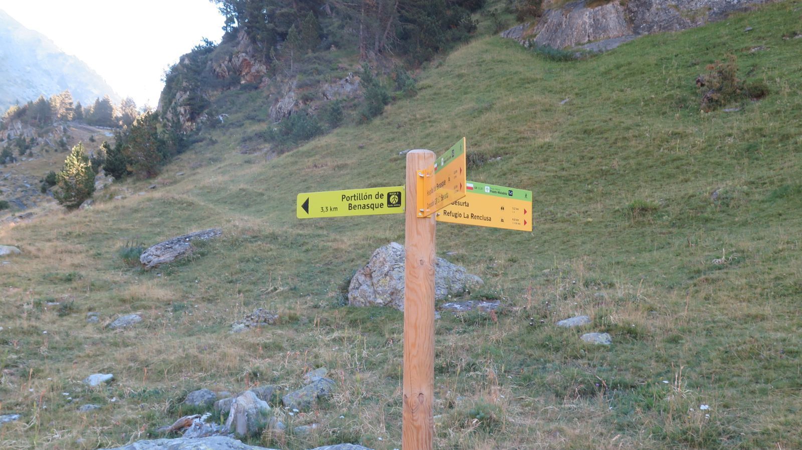 Llevamos algo más de una hora y media de ruta cuando llegamos a un nuevo cruce señalizado con un poste de madera, en el que nuestro camino confluye con el que viene del Portillón de Benás y con el que asciende desde La Besurta.