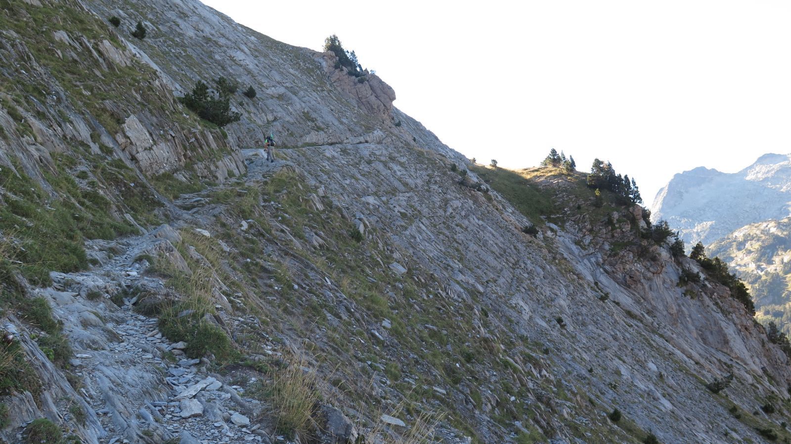 El sendero empieza ahora, progresivamente, a adquirir pendiente, aunque sin llegar a ser muy dura. Son numerosas las pequeñas lazadas que nos ayudan a remontar la Peña Blanca, cuyo nombre (dada su coloración) resulta más que acertado. A nuestras espaldas, mientras ganamos altitud, vamos divisando cumbres de numerosos picos, cuyas nevadas y afiladas cumbres pretenden rasgar el cielo.