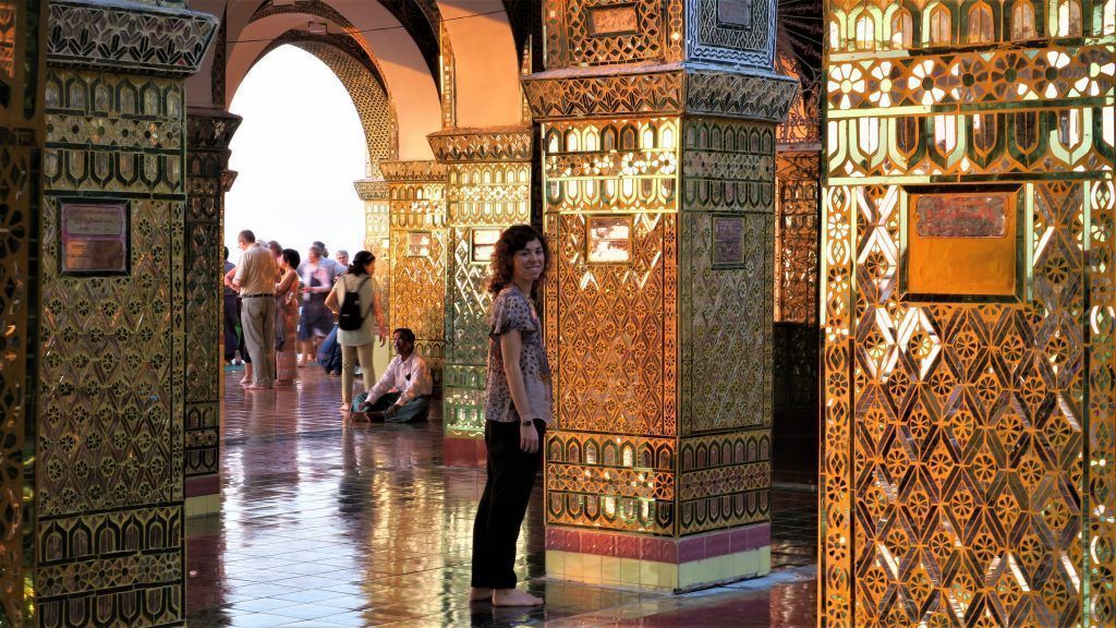 Nos piden un taxi que nos lleva a lo alto de la colina, evitándonos así el tedioso ascenso por la interminable escalera. Nos descalzamos (obligatorio en todos los lugares religiosos de Myanmar) y ascendemos los últimos metros por unas escaleras metálicas, para llegar a la verdadera cima y a la pagoda. Pagamos 1000 MMK por persona (0,6 €) y accedemos al recinto.