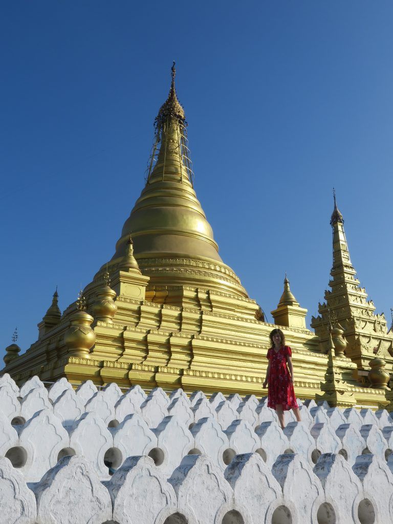 En primer lugar visitamos la Pagoda Sanda Muni. Nos parece sumamente fotogénica, por lo que aprovechamos para tomar mil y una fotos ahora que estamos casi solos. Su estupa dorada brilla con fuerza golpeada por los primeros rayos de luz del día.