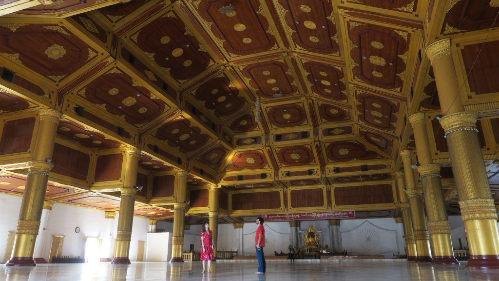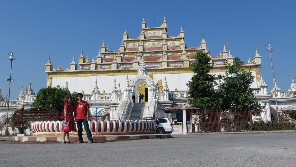 Enfrente del Monasterio Shwenawdan destaca un gran edificio blanco con detalles dorados, y que corresponde a nuestra siguiente visita. Se trata del Monasterio Atumashi, cuyo interior guarda un diáfano espacio en el que encontramos tan solo una pequeña imagen de Buda. Pensábamos que iba a ser más por dentro, la verdad.