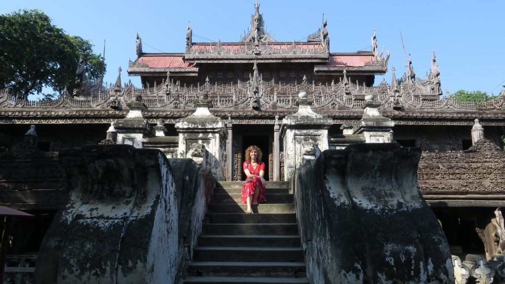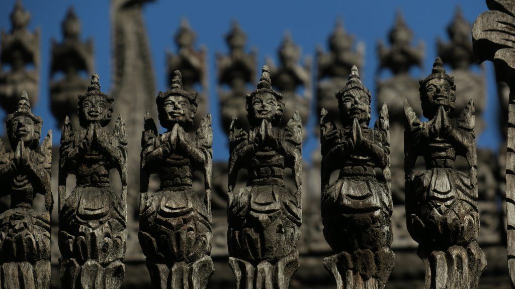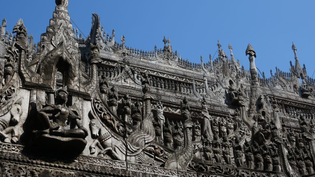 El Monasterio Shwenawdan es una verdadera obra de arte. Construido en madera de teca, nos fascinan los infinitos detalles de sus paredes, barandillas o traveseros. Ornamentado con figuras de Buda, humanas o, simplemente, formas geométricas, no alcanzamos a imaginar la cantidad de horas de trabajo que requirió su construcción.
