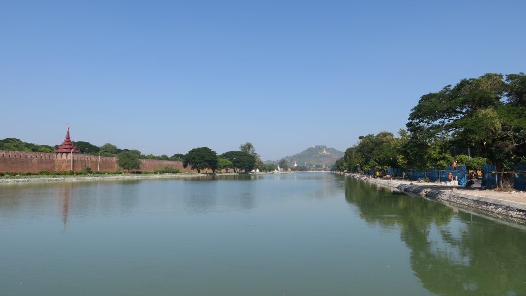Caminamos ahora hacia el sur durante un buen rato hasta alcanzar la entrada del Palacio Real de Mandalay (Mandalay Palace), en la parte este del recinto. Un impresionante foso lleno de agua y atravesado por únicamente cuatro puentes separa el palacio del resto de la ciudad.
