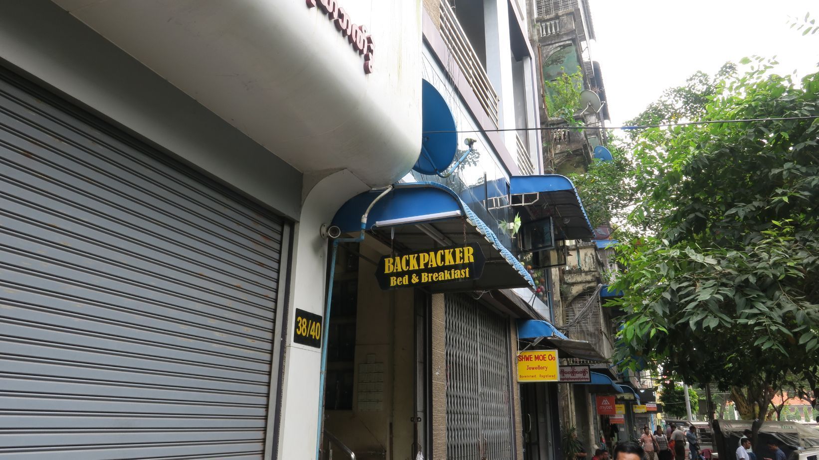 El Backpacker’s Bed & Breakfast sale claramente marcado en nuestra aplicación del móvil, pero no se encuentra justo donde dice nuestra pantalla, sino unos metros más hacia el sur. Un pequeño cartel, junto a unas escaleras algo siniestras, indica la entrada al alojamiento. Vemos alguna rata de tamaño medio-grande corretear bajo los coches aparcados enfrente. ¡Qué poco agradable el recibimiento de Yangon!