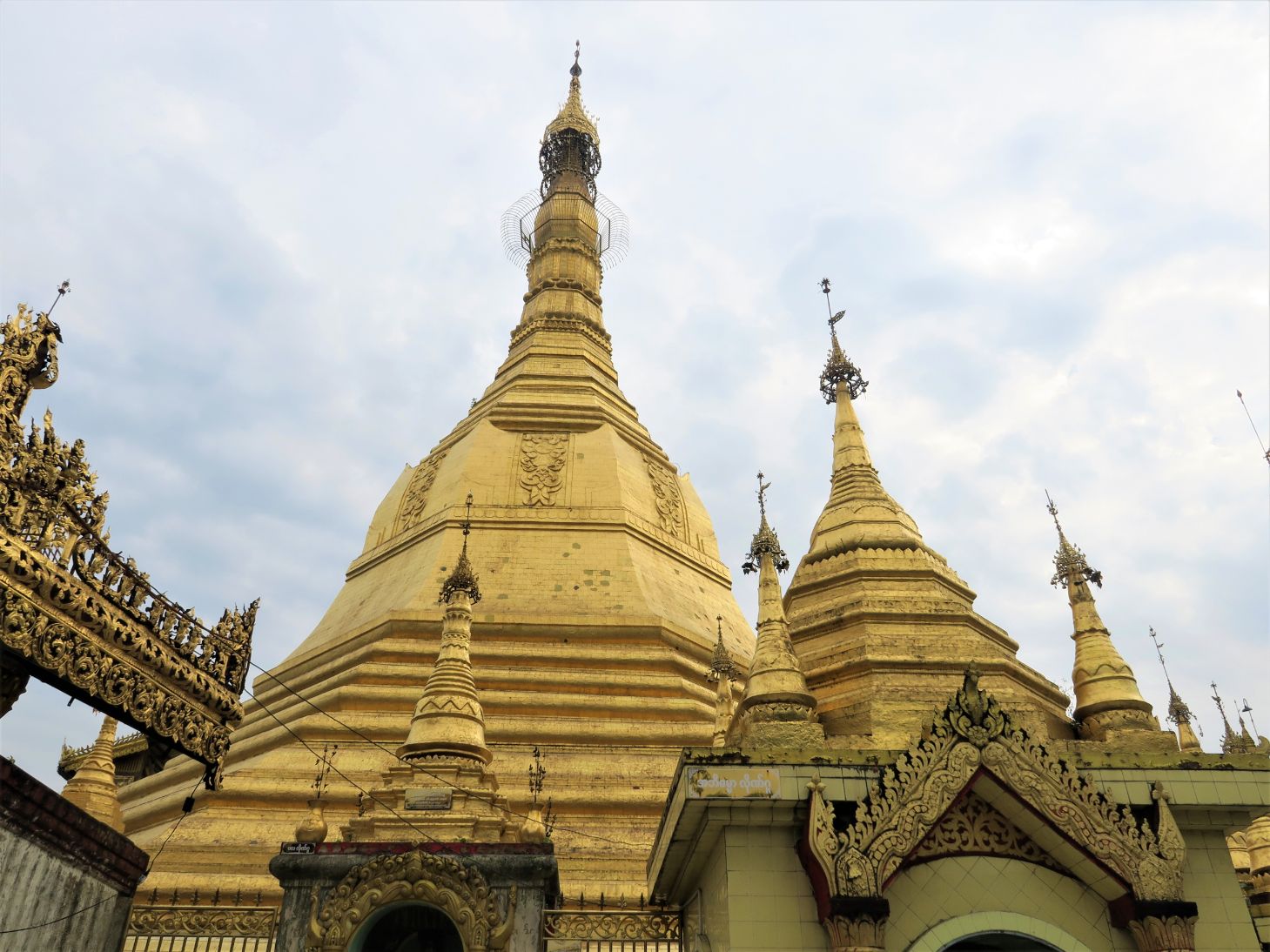 – Shwedagon paya: situada en lo alto de la colina Singuttara, un poco al norte del centro de la ciudad, la Shwedagon pagoda es la más grande de todo Myanmar, con 99 metros de altura. Según cuenta la leyenda tiene 2500 años de antigüedad, aunque los estudios científicos datan su construcción entre los siglos VI y X; sin embargo, la construcción original era más pequeña y alcanzó su tamaño actual en unas obras del siglo XV. Fue dañada en varios terremotos, y posteriormente reconstruida. La Shwedagon está recubierta de una cantidad incalculable de láminas de oro, mientras que su corona superior está decorada con 5448 diamantes y 2317 rubíes. Se trata del lugar más sagrado de todo Myanmar, y en el enorme recinto religioso de la pagoda hay, además de un trozo de tela y ocho cabellos de Buda, numerosos templos. Los lugareños deben rodear la pagoda en el sentido de las agujas del reloj, y comprar flores, velas, banderas o comida para hacer ofrendas en el recinto religioso. La entrada, para turistas, es de 10000 MMK (6€).
