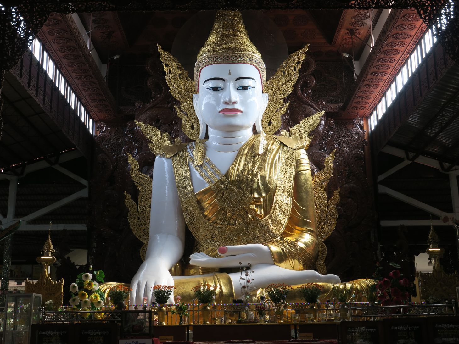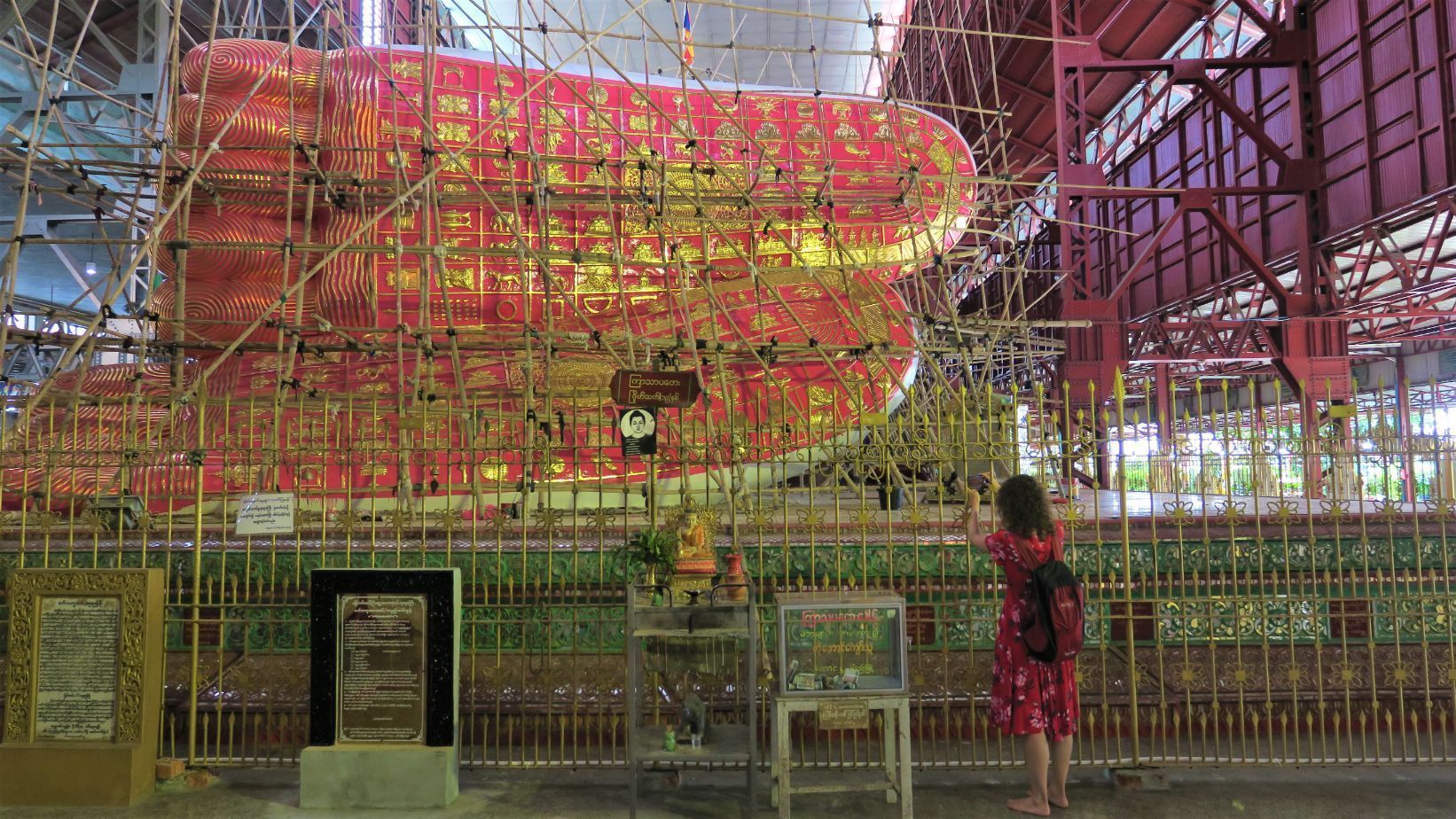 En un trayecto de unos 40 minutos, lento por el tráfico, nos lleva a la pagoda Chauk Htat Gyi. Accedemos a su interior a través de un largo pasillo repleto de puestecillos donde venden flores y otras ofrendas y, una vez dentro, contemplamos el gigantesco Buda tumbado que allí se encuentra. Por desgracia para nosotros, están pintándola y la colosal estatua se encuentra recubierta en su totalidad por andamios. ¡Qué lástima!