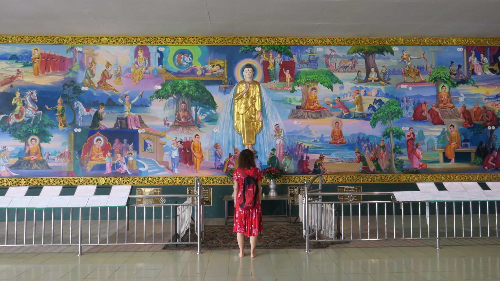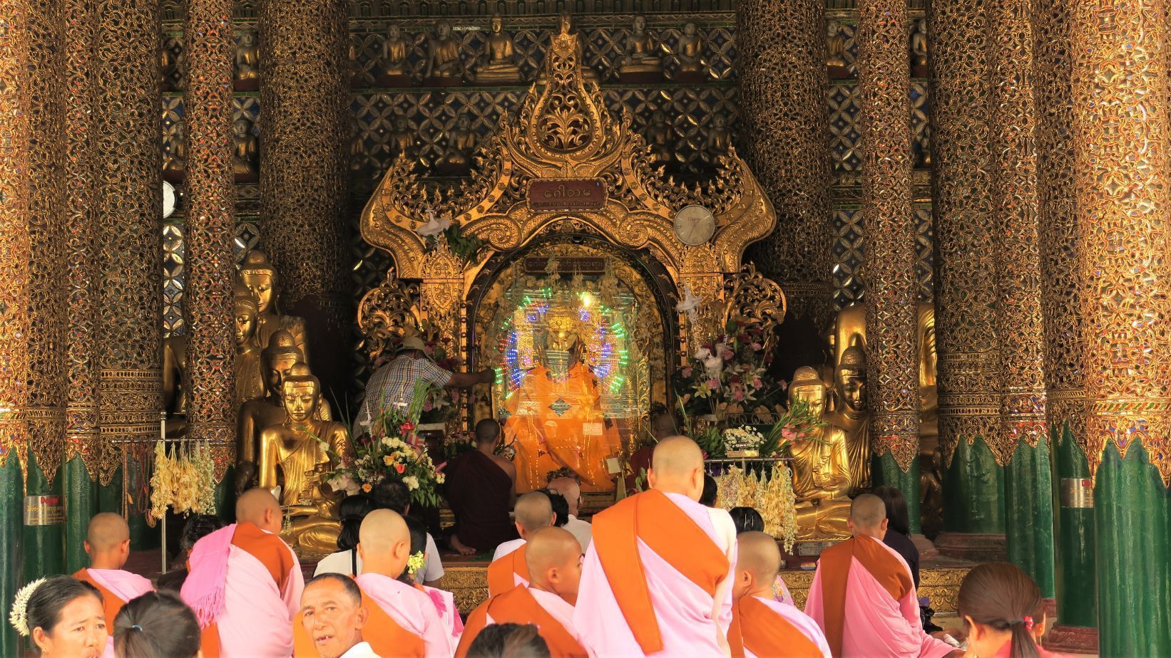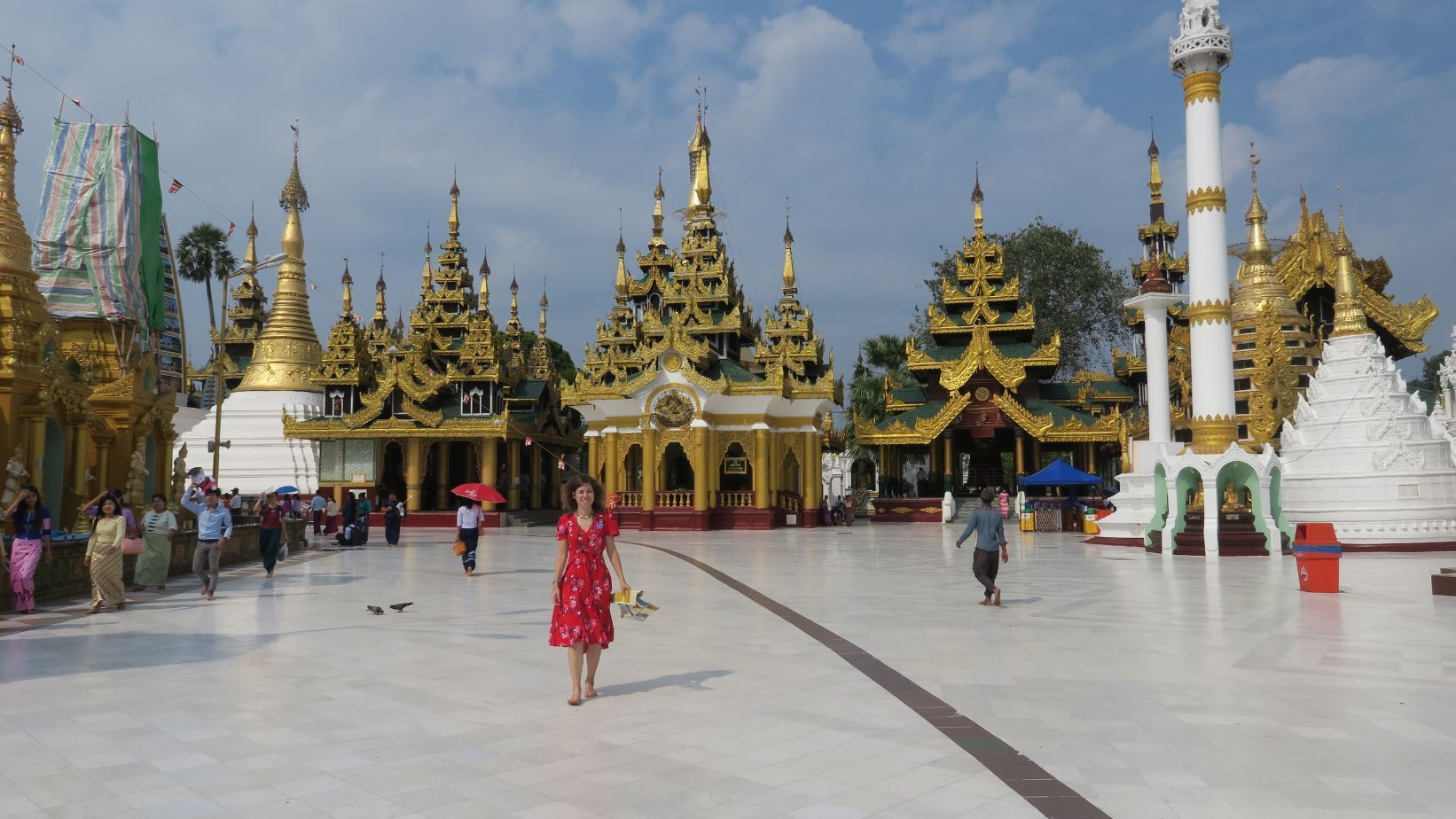 Aunque el día ha salido algo nublado, el suelo blanco y la gran estupa dorada reflejan con fuerza los escasos rayos de sol que les acarician. La pagoda es una auténtica eclosión de colores, brillos y detalles. En cualquier pequeño rincón hay un templo de escasas dimensiones, pero decoración profusa, con detalles cuidados y sublimes.