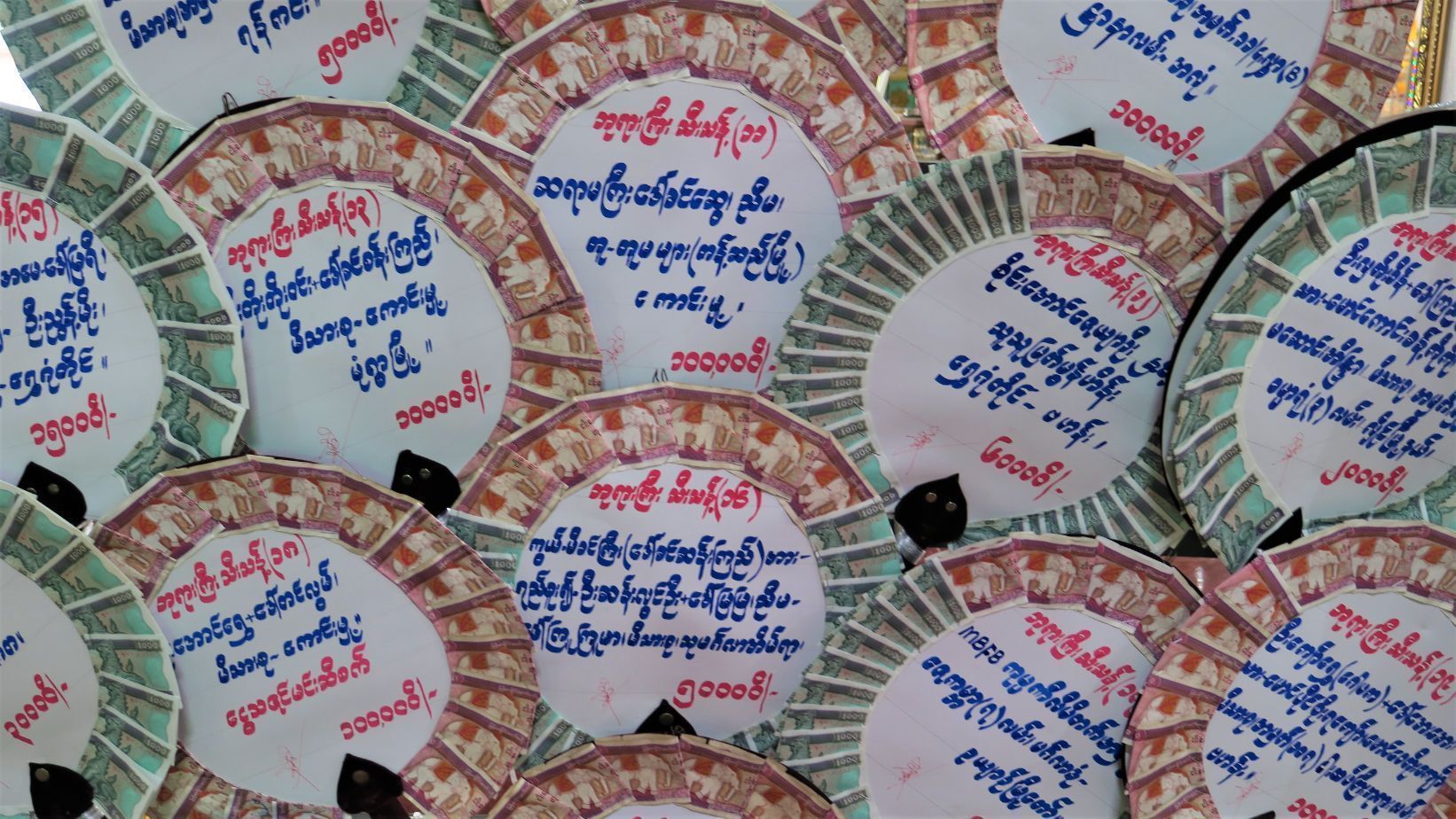 Desde allí nos dirigimos, caminando, a la cercana Ngar Htat Gyi pagoda. Además del grandioso Buda sentado, nos llaman la atención las numerosas ofrendas de billetes en forma de abanicos que hay colgados por todas partes.