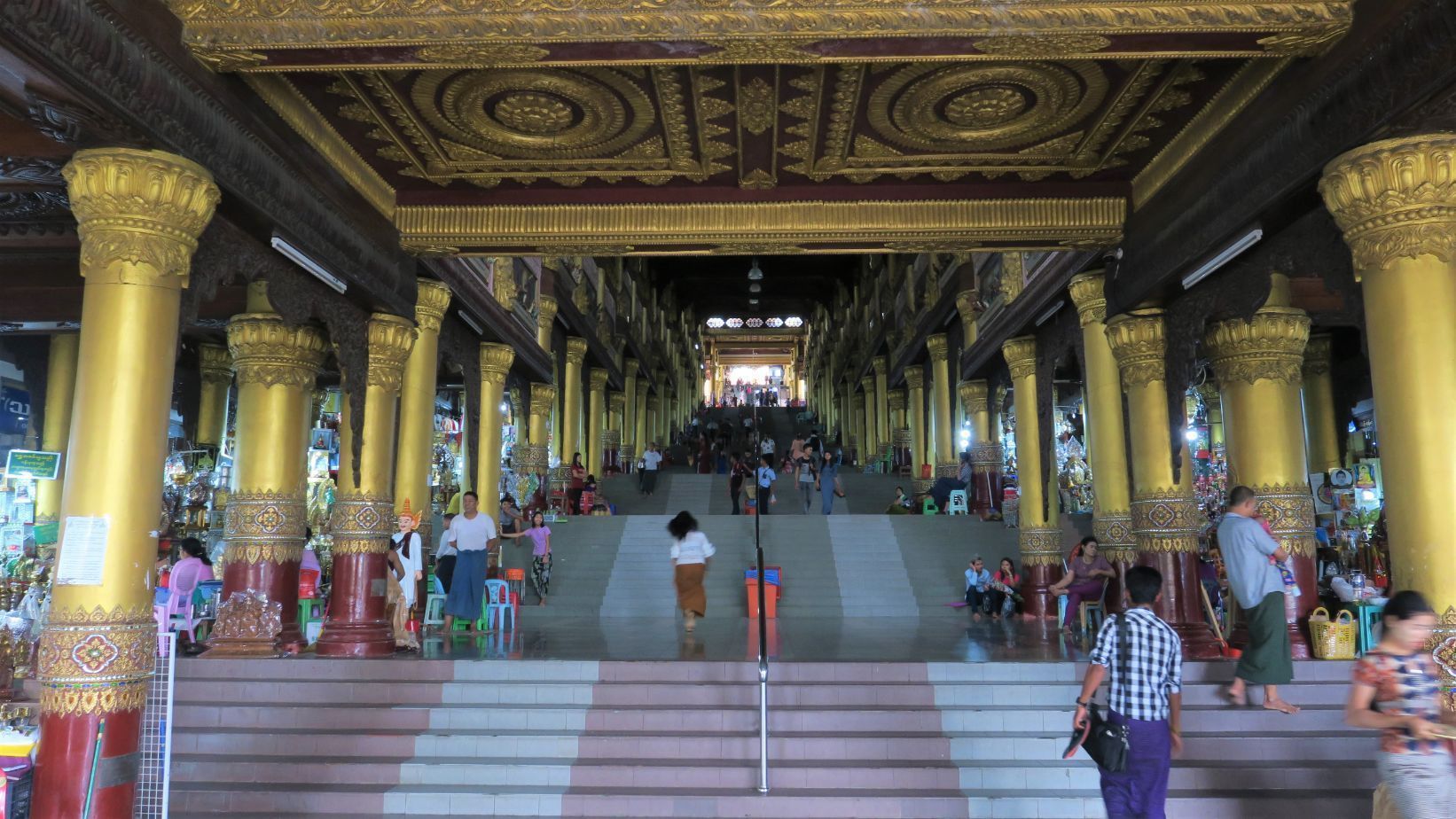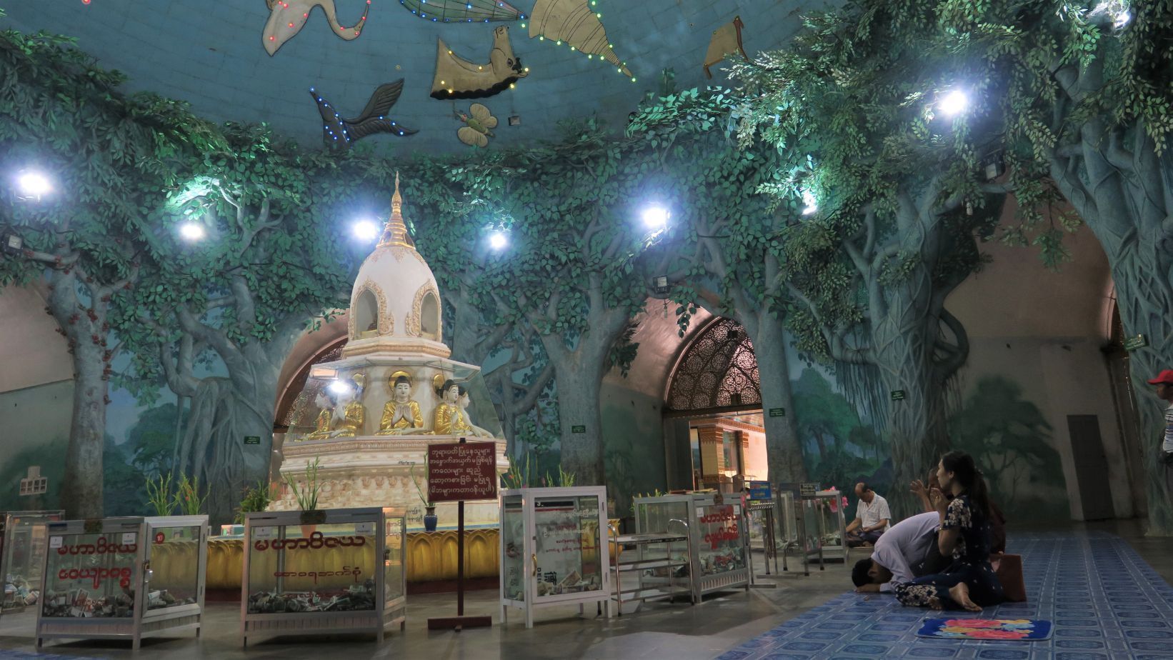 Salimos por la puerta sur de la Shwedagon paya para, enseguida, entrar a la Maha Wizaya, de gran tamaño y con una impresionante estupa dorada. Es de reciente construcción, pero su interior nos parece de lo más curioso, con una bóveda en la que se representan las constelaciones.