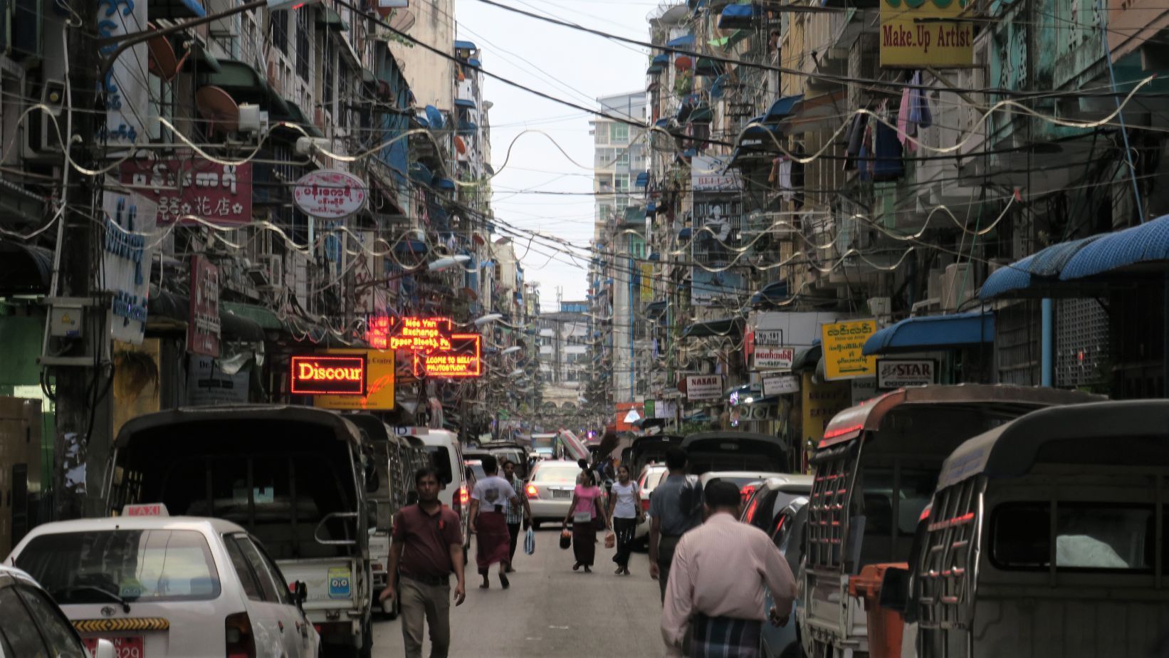 Dejamos atrás la visita a Golden Rock y, tras un trayecto en autobús de unas cuatro horas, llegamos a las afueras de Yangon, en medio de un atasco interminable. Cuando, por fin, paramos en la estación de autobús, recién caída la noche, nos vemos sumidos en un caos absoluto. Centenares de furgonetas, autobuses y minibuses intentan maniobrar entre miles de personas, taxis y coches particulares; suenan cláxones y un alboroto generalizado mientras descargamos nuestras mochilas.