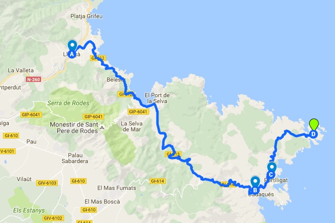 | Ruta realizada el primer día. A) Llançà B) Cadaqués C) Portlligat y D) Cap de Creus. |