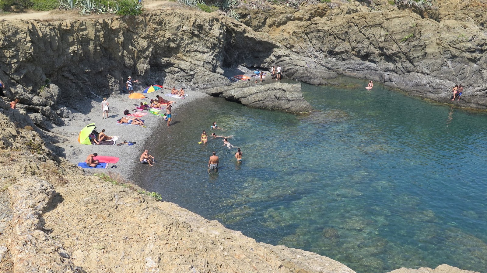 Nos acercamos a una de las pequeñas calas de piedra pequeña, con gente aunque sin resultar agobiante. Disfrutamos de un agradable baño, puesto que el sol hoy calienta con fuerza.