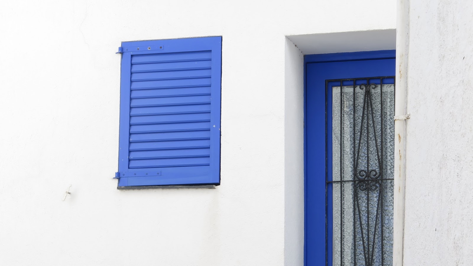 | Casas blancas de puertas y ventanas azules. |