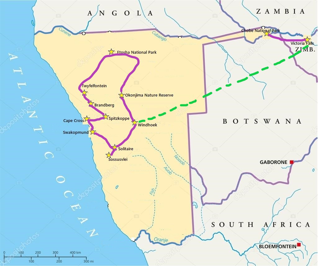 En total 3028 kilómetros por las carreteras y pistas de Namibia, viajando por libre en un emocionante roadtrip. Desde la reserva natural de Okonjima, pasando por el fabuloso Parque Nacional de Etosha, hasta las maravillas naturales de Spitzkoppe o Sossuvlei. El contraste del desierto del Namib con la frondosa selva que rodea a las Cataratas Victoria. Un viaje soñado que se hizo realidad en mayo-junio del 2018.