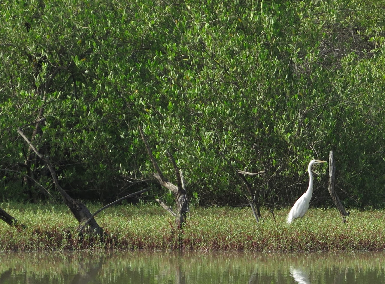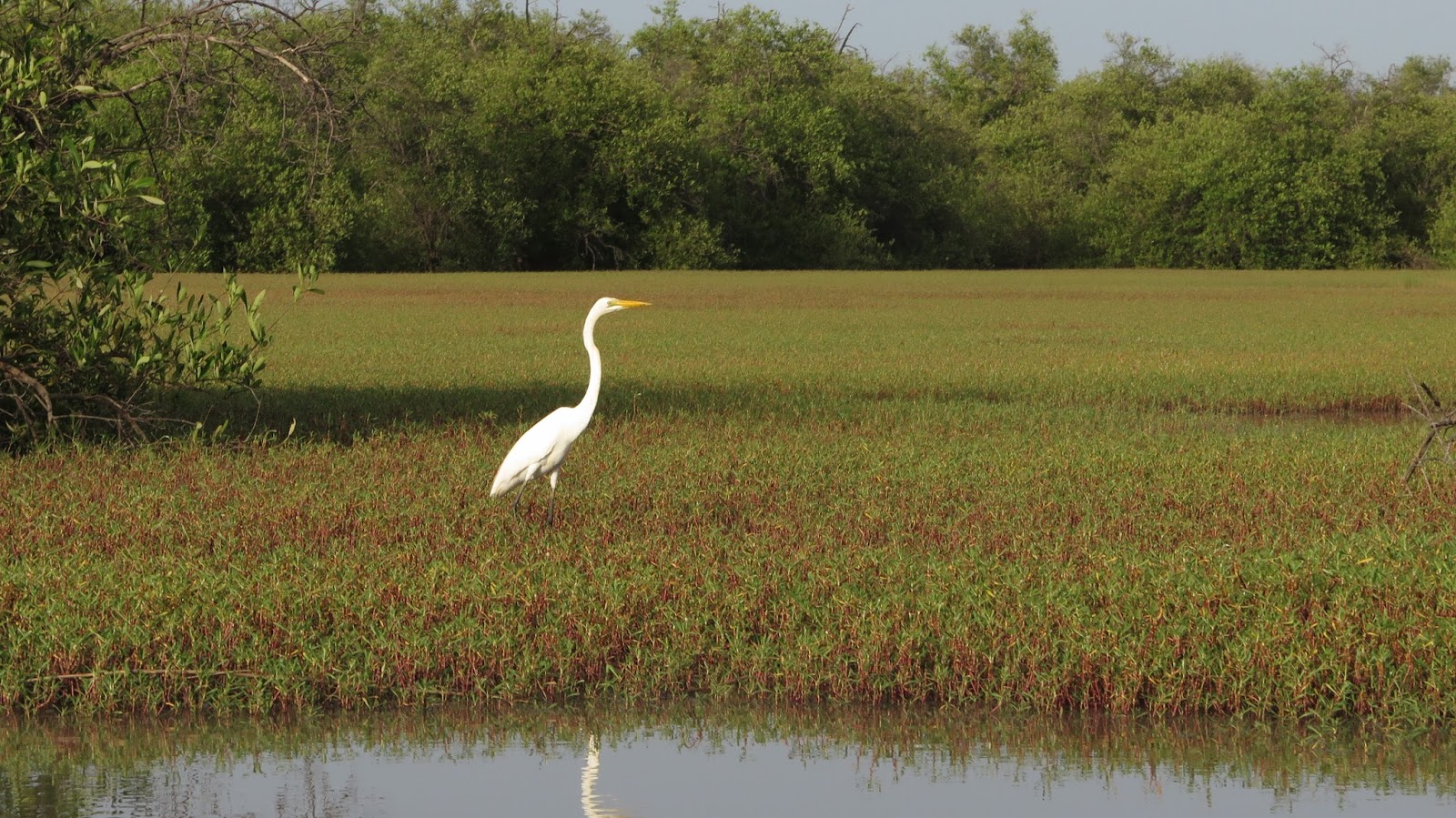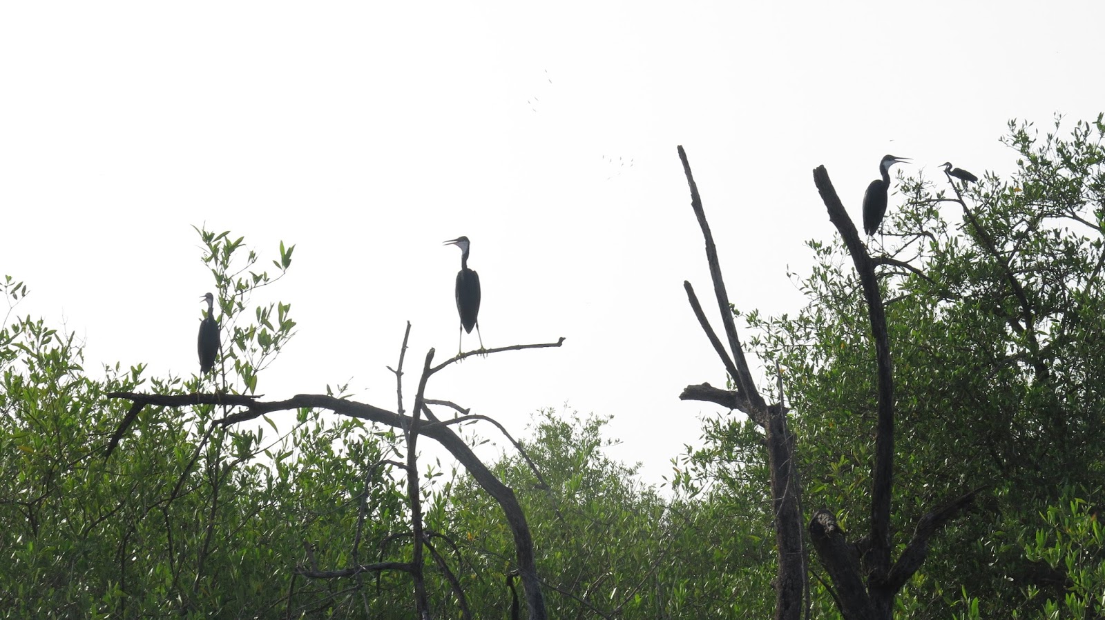 Pronto empezamos a ver numerosas aves. A pesar de no ser expertos ni estar especialmente interesados por la ornitología, el lugar y la visita son impresionantes. Reconocemos algunos pelícanos, garzas e incluso al martín pescador gigante (Megaceryle máxima). También, en el camino de regreso, nos topamos con algunos tímidos colobos rojos, que nos observan escondidos entre los árboles.