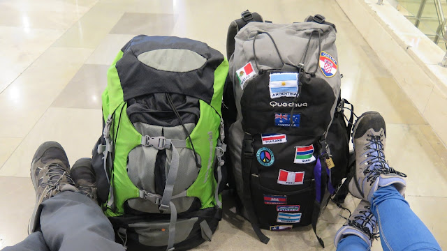 En el aeropuerto, antes de emprender el viaje. Con botas y mochila, por supuesto.