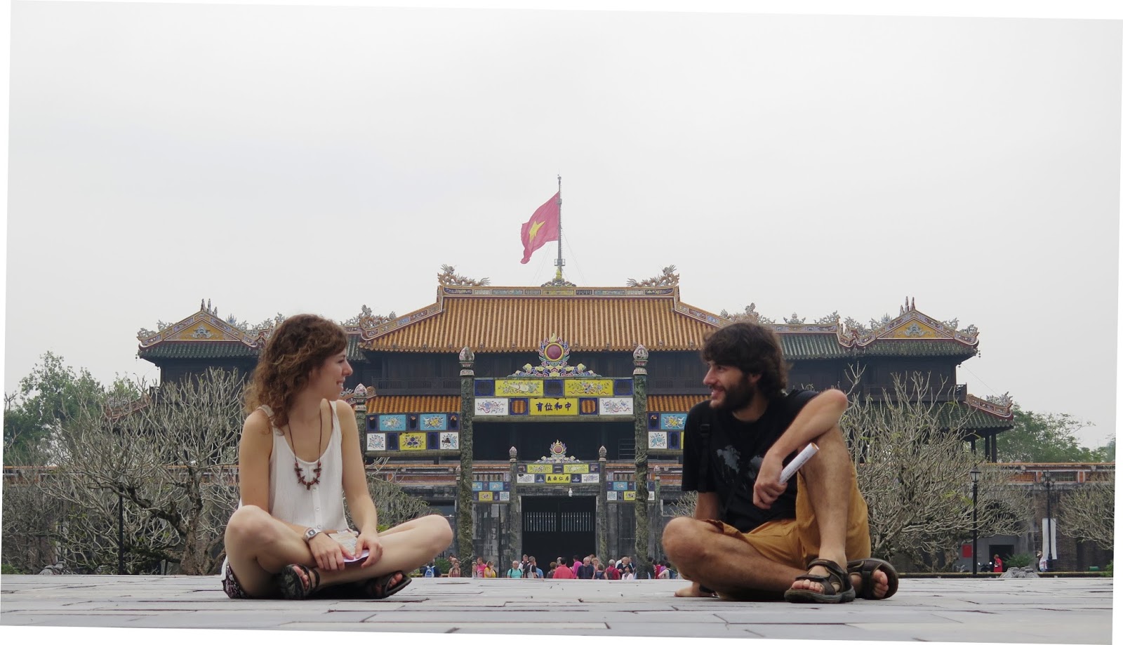 Sentados en la ciudadela imperial de Hue.