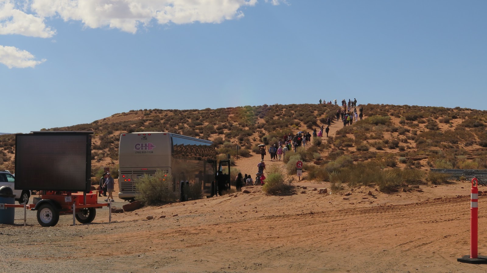 Dejamos el coche en el gran aparcamiento visible desde la carretera, el cual está casi lleno. Desde allí tenemos que caminar, por una pista de tierra sencilla aunque con algo de desnivel, un poco más de un kilómetro hasta llegar a los miradores de Horseshoe Bend. Aunque es un paseo de unos 15 minutos, es más que recomendable llevar algo de agua para contrarrestar el calor sofocante.
