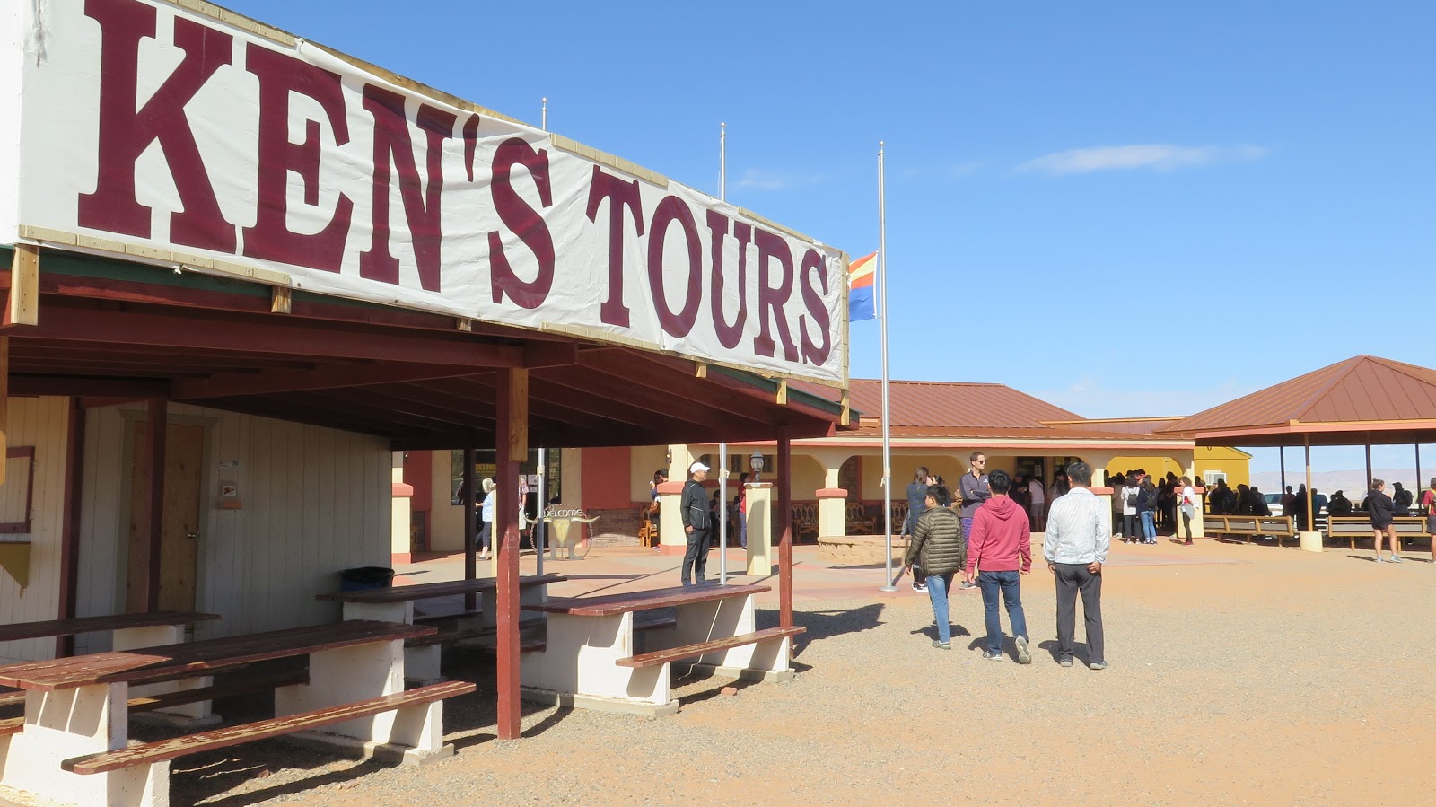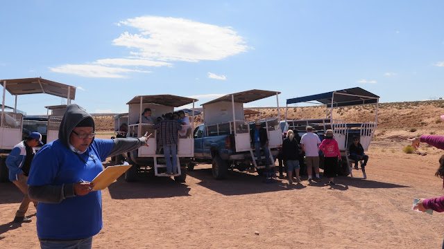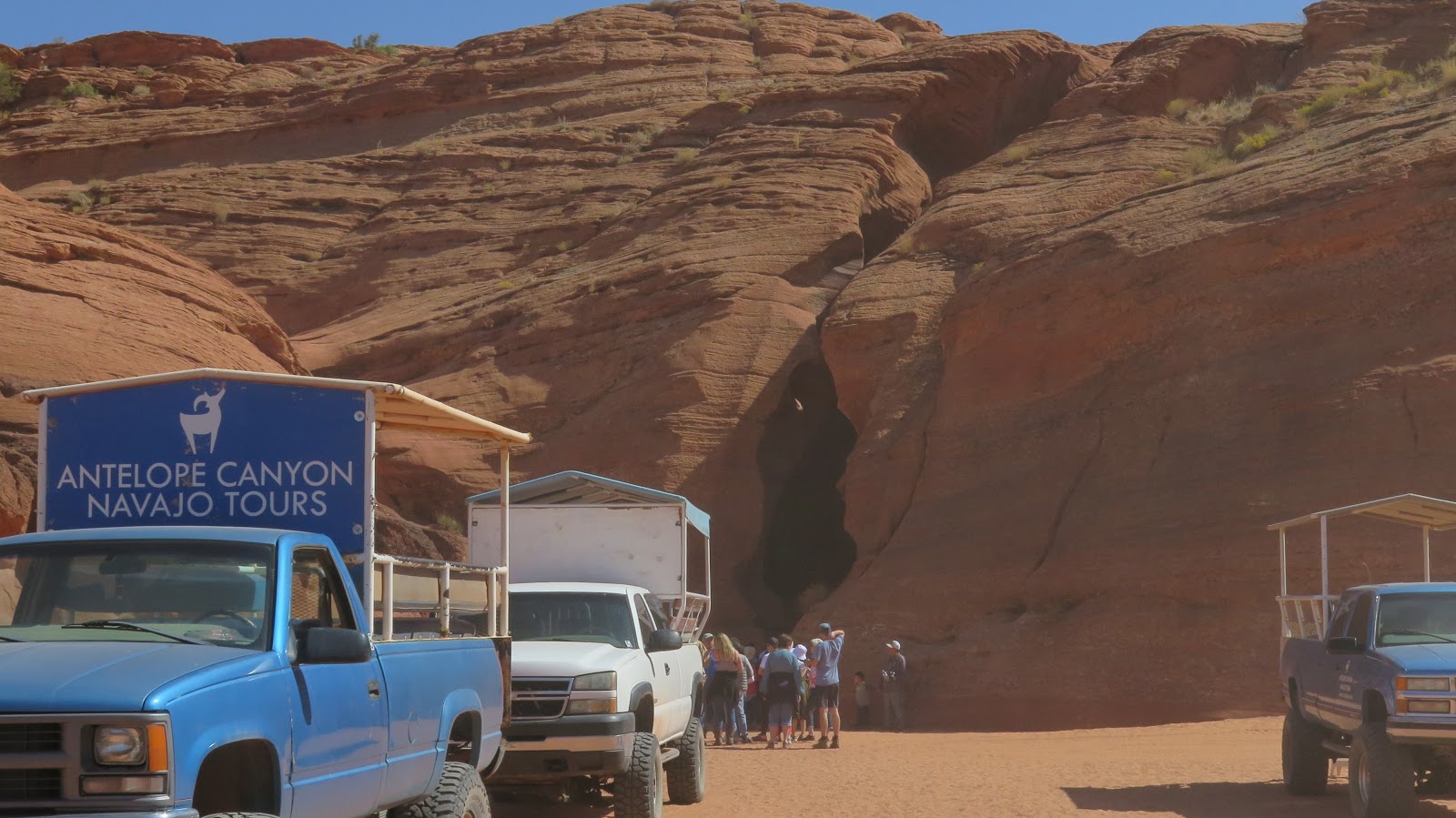 Volvemos al coche y aprovechamos para comer y beber algo. Pero tampoco podemos perder demasiado tiempo puesto que debemos ir hasta la sede de Navajo Tours, donde comenzaremos la visita al Upper Antelope Canyon. El trayecto en coche es muy breve, de menos de cinco minutos, y nos lleva a un gran aparcamiento en el que un incontable goteo de personas entra y sale. Dejamos nuestro vehículo y nos acercamos al lugar donde comprueban las entradas.