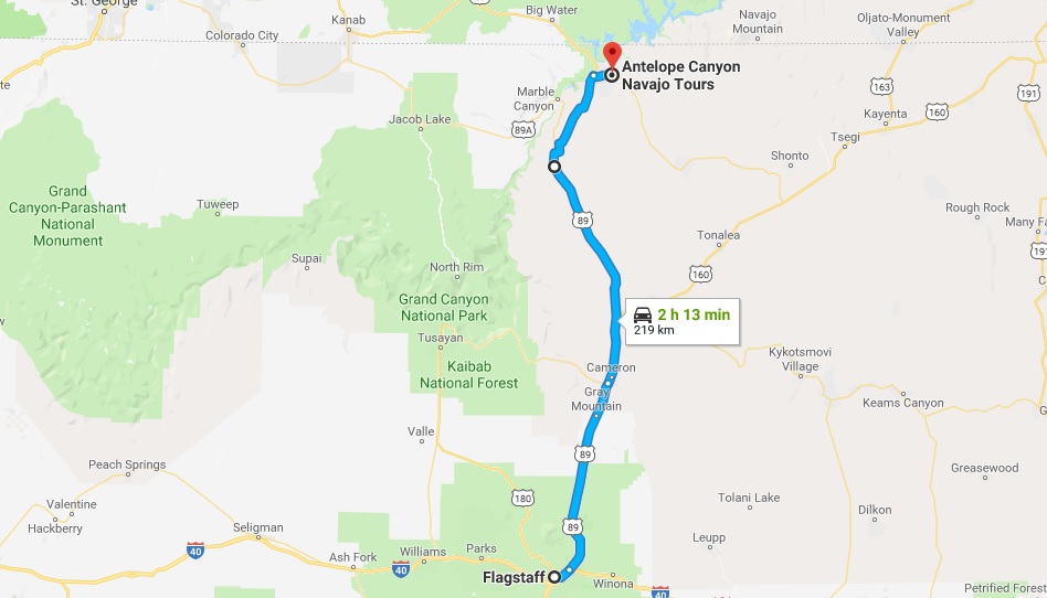 – Si estamos realizando la Ruta 66: desviarnos hacia el norte en Flagstaff por la US-89. Un poco antes de llegar a la localidad de Page, tomar el desvío hacia el este por la carretera AZ-98 (en total 219 km; 2 horas y 15 minutos).