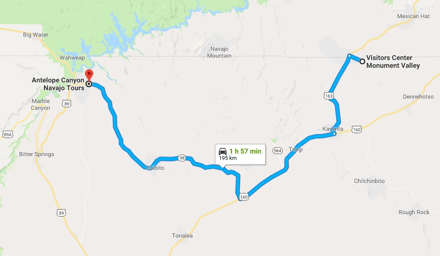 | Ruta desde Monument Valley a Antelope Canyon. |