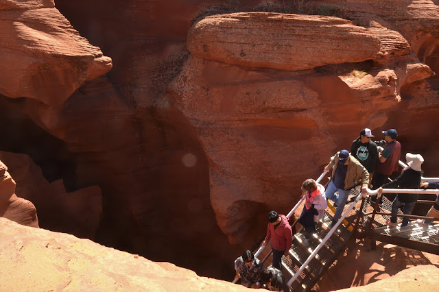 – El Lower Antelope Canyon es algo distinto al anterior. Para comenzar, pensamos que no es apto para todos los públicos. El acceso se realiza caminando y entrando por la profunda ranura del cañón, debiendo descender por varios tramos de escaleras metálicas algo incómodas y, probablemente, difíciles para gente de edad avanzada o con movilidad limitada. La longitud del cañón casi alcanza los 600 metros, entrando por una punta y saliendo por la otra, y no es tan profundo como el Upper (por lo que es algo más luminoso). Aunque no está tan masificado, también hay mucha gente.