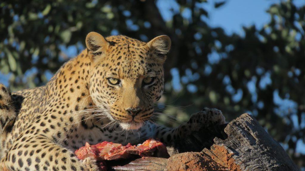 Leopardo comiendo en el centro de rehabilitación.