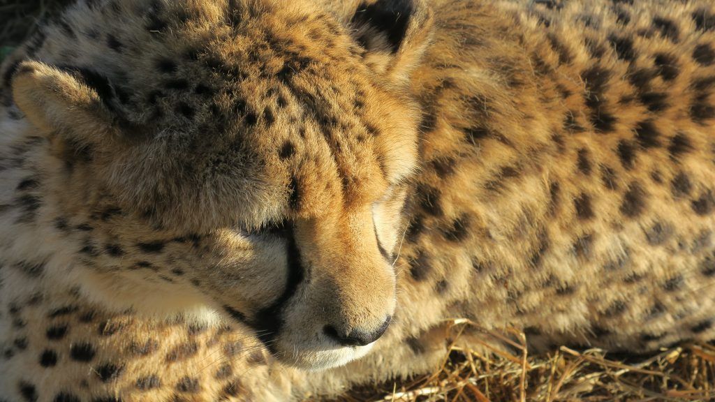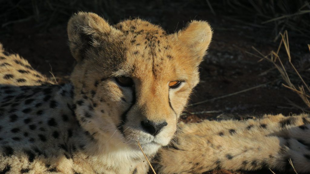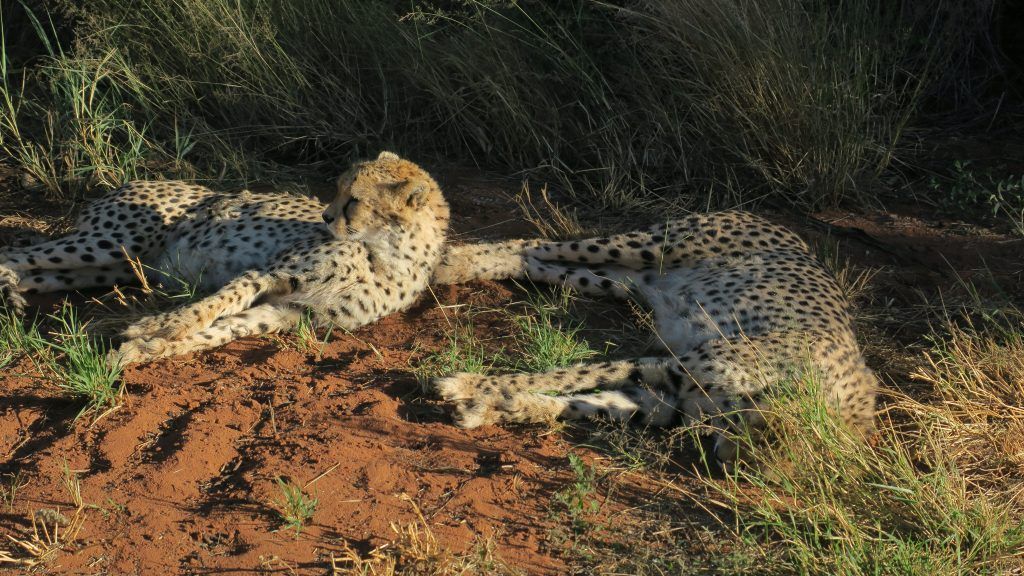 Más tarde nos acercamos a la zona donde se hallan los guepardos. Comienza a descender el sol en el horizonte y, aunque nos cuesta un buen rato encontrarlos, los descubrimos dormitando en una zona de sombra. Un privilegio estar a tan pocos metros de estos animales tan espectaculares. Según nos cuenta el guía, los ejemplares que vemos están finalizando su proceso de rehabilitación y en las próximas fechas podrán liberarlos a la reserva para que lleven su vida normal.