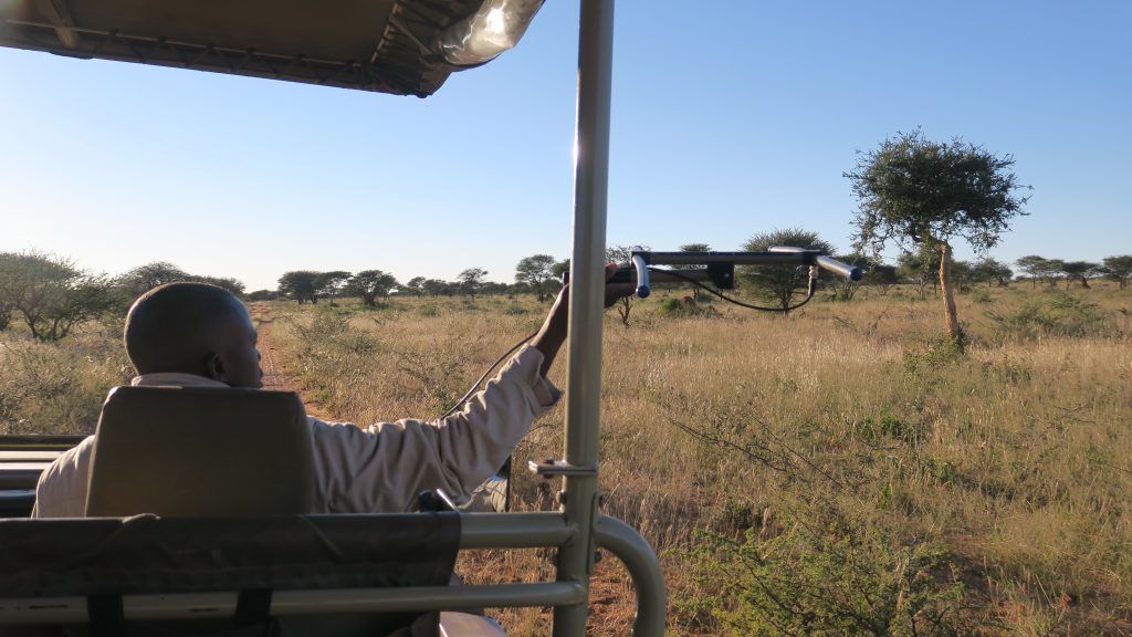 Abrigados, puesto que hace mucho frío a estas horas, montamos nuevamente en el todoterreno (esta vez acompañados por unos alemanes) para realizar un safari por la reserva, con la intención de ver algún leopardo. Algunos de ellos llevan collares de radio, por lo que el guía, provisto de una antena, los puede localizar sin tanta dificultad (aunque, como veremos posteriormente, no resulta ni mucho menos fácil; según nos dice el guía en el 50% de las ocasiones no hay éxito).