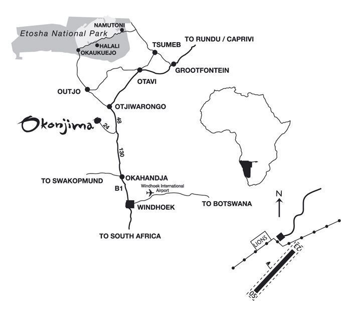 Okonjima es un punto de paso «natural» para aquellos que llegan a Namibia por el aeropuerto de Windhoek y se desplazan hacia el norte (Etosha).