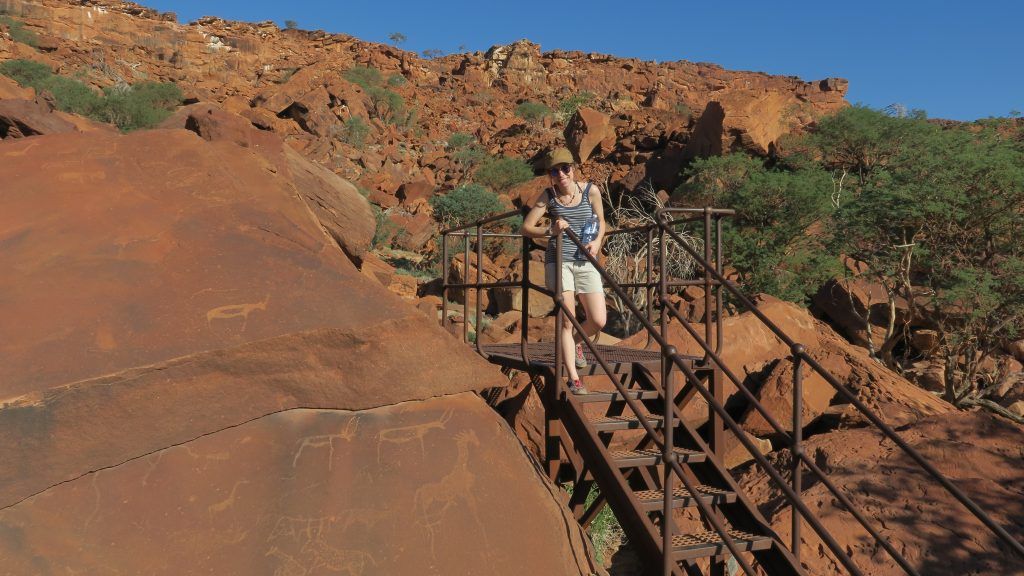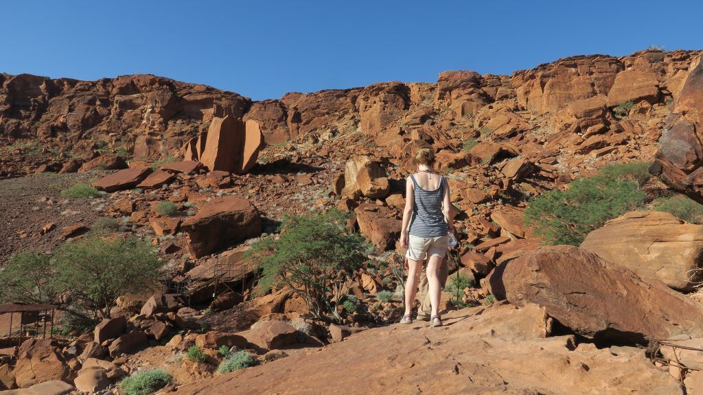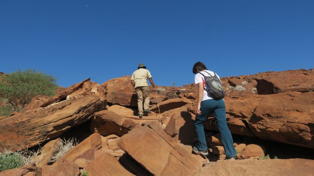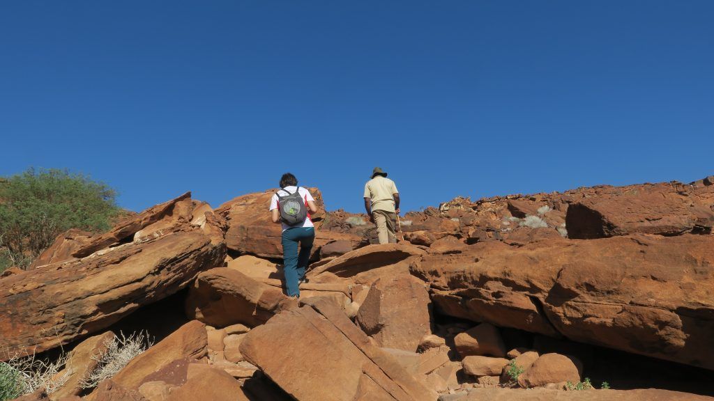 Visitar Twyfelfontein no es, ciertamente, cómodo. La visita, de aproximadamente una hora y media de duración, se realiza caminando por unos senderos vagamente marcados y, a ratos, saltando de roca en roca.